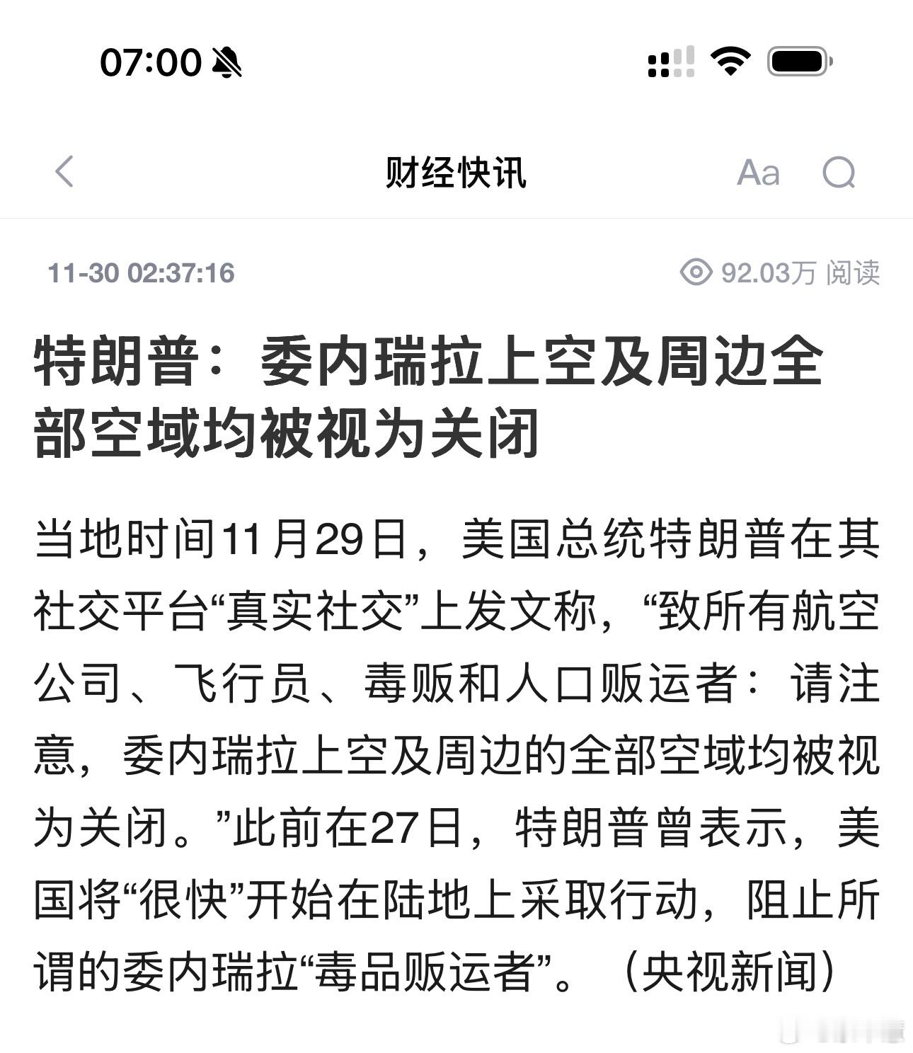 特朗普下"空中禁令"!委内瑞拉空域全关闭,毒贩、航班全不准进?当地时间11月29日,特朗普在“真实社交”上的发文直接炸了——“委内瑞拉上空及周边全部空域视为关闭” ,喊话对象连航空公司、飞行员带毒贩、人贩子全囊括,这是把空域直接变成“禁区”!更让人揪紧心的是,3天前他刚放话“很快在陆地行动阻截毒品贩运”,现在又封空域,等于海陆两头“锁死”委内瑞拉。有人慌了:国际航班会不会大面积改道?油价会不会因为美洲局势动荡再涨价?也有人疑惑:这到底是为了禁毒,还是另有所图?其实咱们普通人最关心的是,航班变动会不会影响出国行程?油价涨了会不会让加油费再变贵?你觉得这波“空域禁令”对咱们的生活影响大吗?评论区说说你的担心或看法!