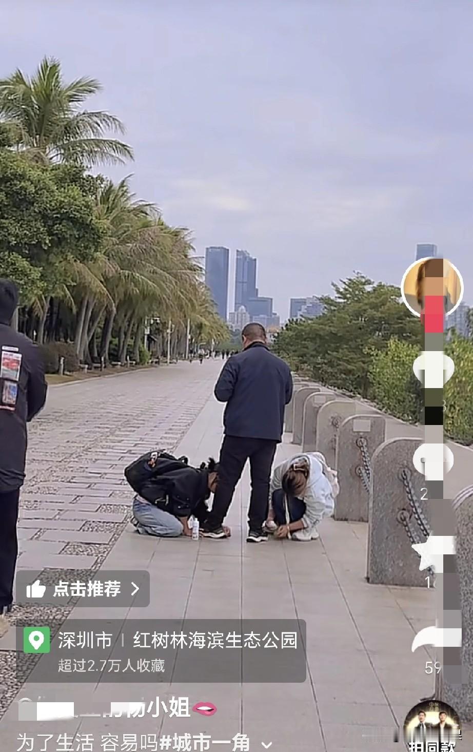 网友拍摄到深圳湾公园的这一幕,两名年轻女子一左一右的,疑似在给一位中年男人擦鞋。 这可是两位年轻妹子啊!真的不多见,现在就业环境到这种地步了吗?年轻女孩子轮流的大街上给别人擦鞋。想都不敢想,在大家的印象中女孩子随便找个男朋友,不都是衣来伸手、饭来张口吗。 难道现在的年轻男孩子们也清醒了,不再做舔狗,导致很多女孩子只能自己去找工作谋生了。