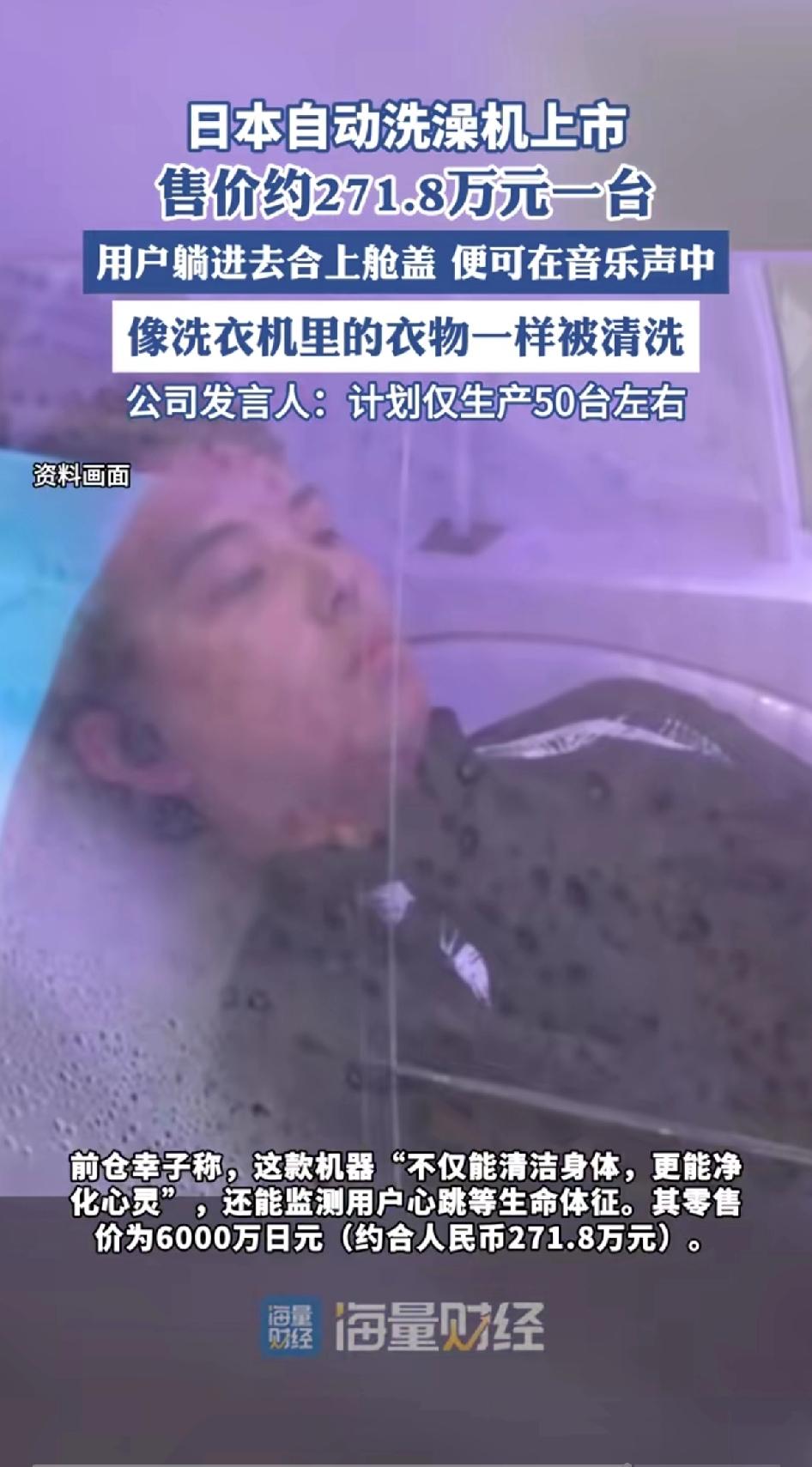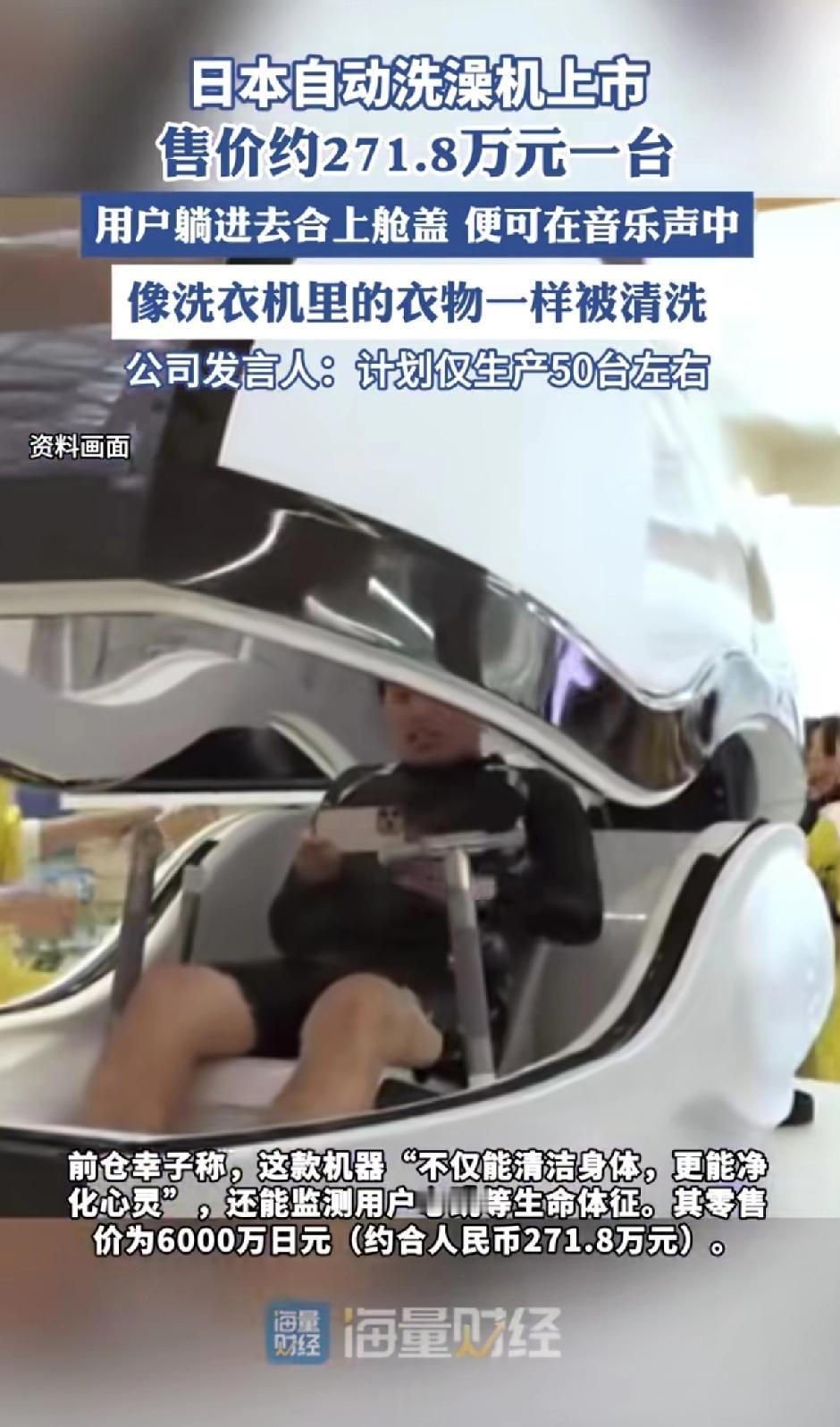 日本自动洗澡机上市,售价271.8万元一台,这洗澡机有个长椭圆清洗舱,人躺进去关上舱门,就能在音乐声里被清洗,就像洗衣机里的衣物一样被清洗,还能监测心跳等生命体征,厂家说它“不仅能清洁身体,更能净化心灵”。 这营销手段真是新颖,洗个澡就能净化心灵。 不过,它的价格可不亲民,零售价约合人民币271.8万元一台。 而且公司计划就生产50台左右,说是稀缺性就是产品魅力。这价格,这产量,感觉就是面向少数人的高端玩意儿。 去澡堂洗澡让人搓背,连吃带喝,不比花高价用洗澡机舒服。 不知道花这么多钱买它来洗澡,洗的到底是身子,还是那份独特体验呢?