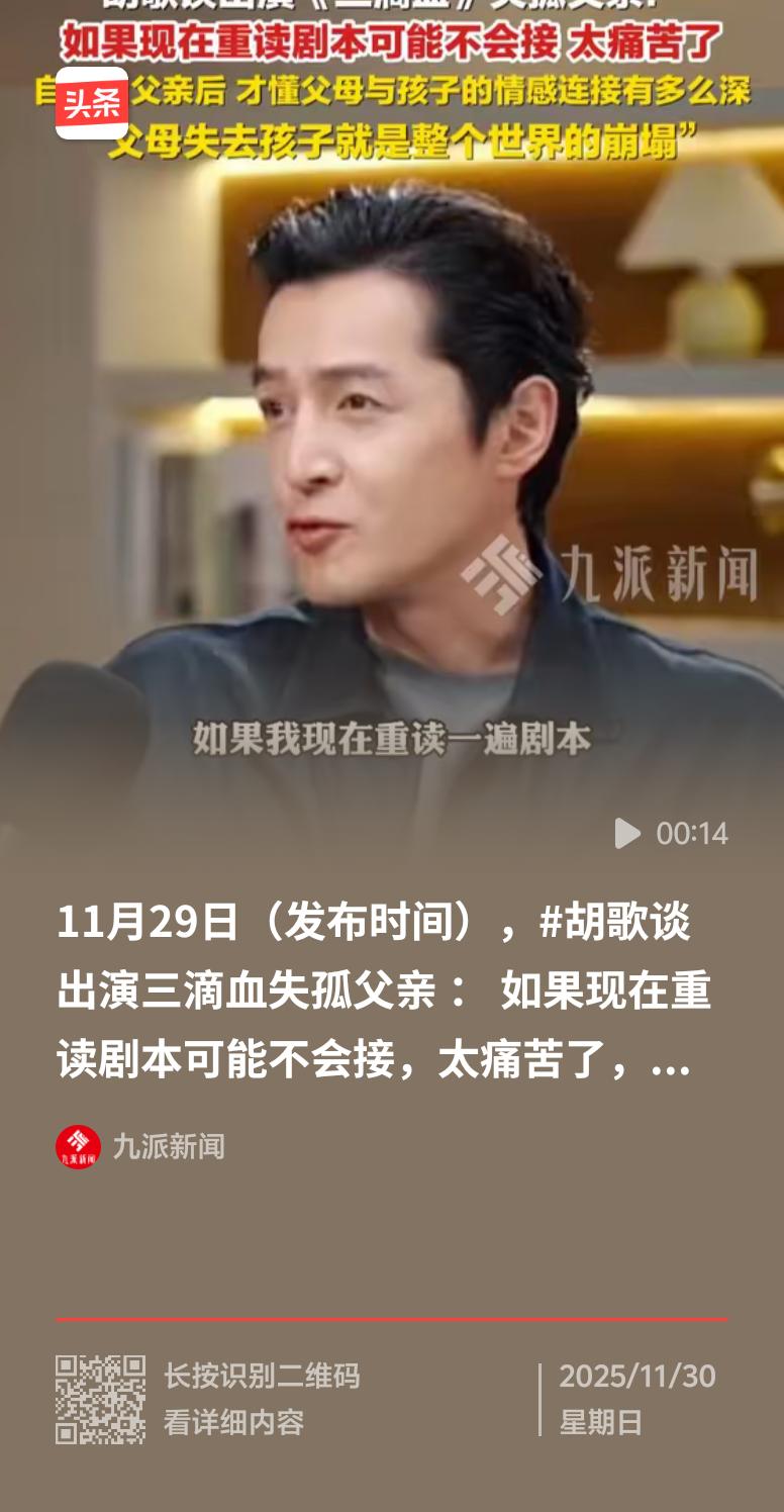 11月15日《三滴血》全国公映,此前上海首映礼胡歌等主创齐聚。胡歌在片中饰演为寻子不择手段的父亲“驯鹿”,他在角色里找到了父爱的出口。胡歌曾说庆幸在成为父亲前接演,因为离真实人性和父亲最深的恐惧太近,他会犹豫。 11月17日路演,胡歌表示现在成为父亲后再看剧本,没勇气挑战这角色。他说作为父亲,不愿在电影世界感受失去孩子的痛苦。不过他也认可影片揭露人口贩卖黑产的意义,强调不能用恶制恶,要相信法律和公安。 胡歌