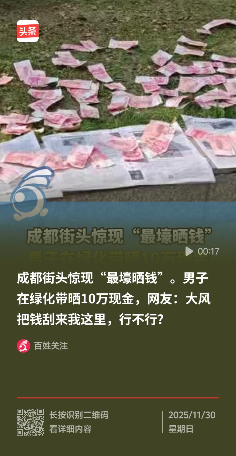 11月28日,四川成都天府大道中段惊现奇景,一男子在绿化带摊开大量现金晾晒。据视
