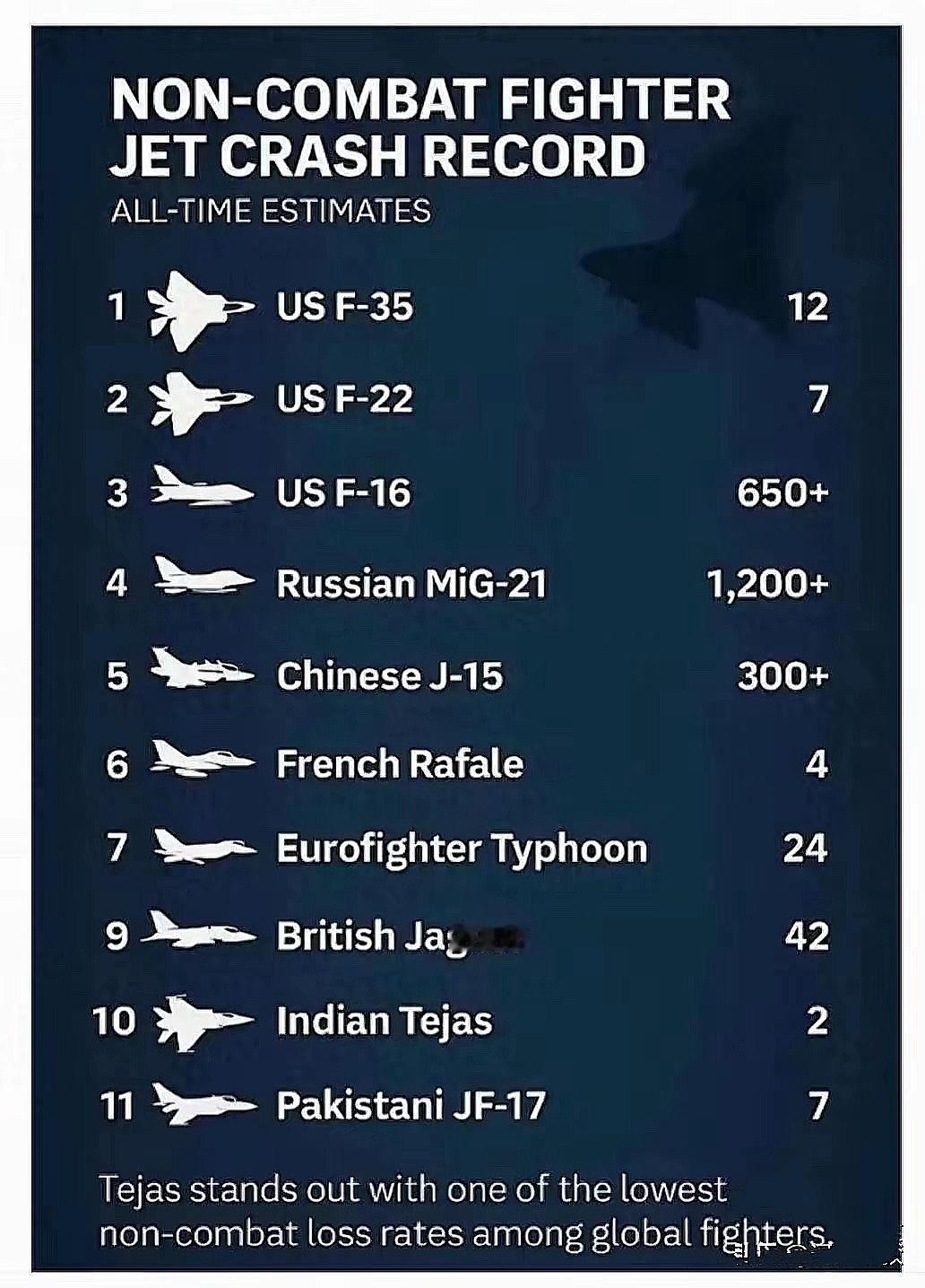 摔急眼了?印度这张坠机统计表,直接让人无语! 倾全国40年之力打造的国产先进战机LCA光辉战机在迪拜航展上坠毁了,可能是为了挽回面子,印度方面统计了所谓的全球主力战机坠毁数据。 从表中可以看到,光辉战机只坠毁了两架,而别的国家出产的主力战机,数量几十、几百甚至上千的都有,数据注水非常严重。可以看出,印度方面竭力想传达一个理念,虽然我家坠机了,但别人家也坠机,甚至坠更多,那我家这两架根本不算什么! 表中最夸张的歼15,印度方面统计的坠机数量居然超过300架!这样的数据比注水猪肉还让人无语! 看到这个表格,网友们瞬间不淡定了,甚至喷饭! 怎么说呢?据统计,在印度方面做数据之前,歼15产出的总数量才在150架左右,连200架都不到,就当印度方面的统计是真的,那多出来的100多架歼15战机,是从哪来的,难道是印度国内产的? 还有网友表示,如果印度方面统计的数据是真的,那只有一个可能,也就每架歼15飞机摔下来后,很坚强,重新站了起来,起飞后又再次摔了一次! 只有这样,才有可能统计出300+的摔机数量…… 也有网友说,直到前几天,歼15才下线第299架。好家伙,按印度方面的说法,那就是每一架飞机下线后起飞就摔了,这是什么脑洞大开的想法呀? 当然,也有网友替印度方面打圆场,他们认为,数据可能是真的,但统计来源,不仅仅包括歼15的真飞机,还包括各种模型,以及小朋友手中的玩具飞机,只要摔到地上,就算一次,如此累计…… 截止2025年11月,歼-15系列舰载战斗机的总服役数量约为 150至180架 ,这一数字涵盖了基本型(歼-15/S/DH)及弹射型(歼-15T/DT)等衍生型号。 歼15系列是部署在航空母舰上的舰载机,其中,辽宁舰上大概部署了24架,山东舰上配备36架,最新的福建舰数量估计有50架左右,加上训练用的,总数估计在150架左右,印度是懂统计的。 建国初期,我国航空工业基础近乎空白,一步一步走到现在,拥有了世界最大最先进的风洞实验室。 据了解,每架飞机定型前后,会进行无数次空中模拟,进行数据调整、修改,只有达到平稳的安全指标后,才可能由飞行员驾驶战机进行空实。这样的稳妥操作,基本上杜绝了损失战机的可能性。 不过,印度方面喜欢夸大其词,也是有先例的。 62年,对印自卫反击战,仅仅打了32天,印度就遭遇军事、国内层面以及外交层面的三重惨败,可印度依然说自己大胜;今年印巴空战被击落7架飞机,其中包括阵风战机4架,印度不仅不承认,为掩盖战场失利,还成立宣讲团到各国去宣扬胜利! 所以,印度方面能做出这样的表格,一点不奇怪。