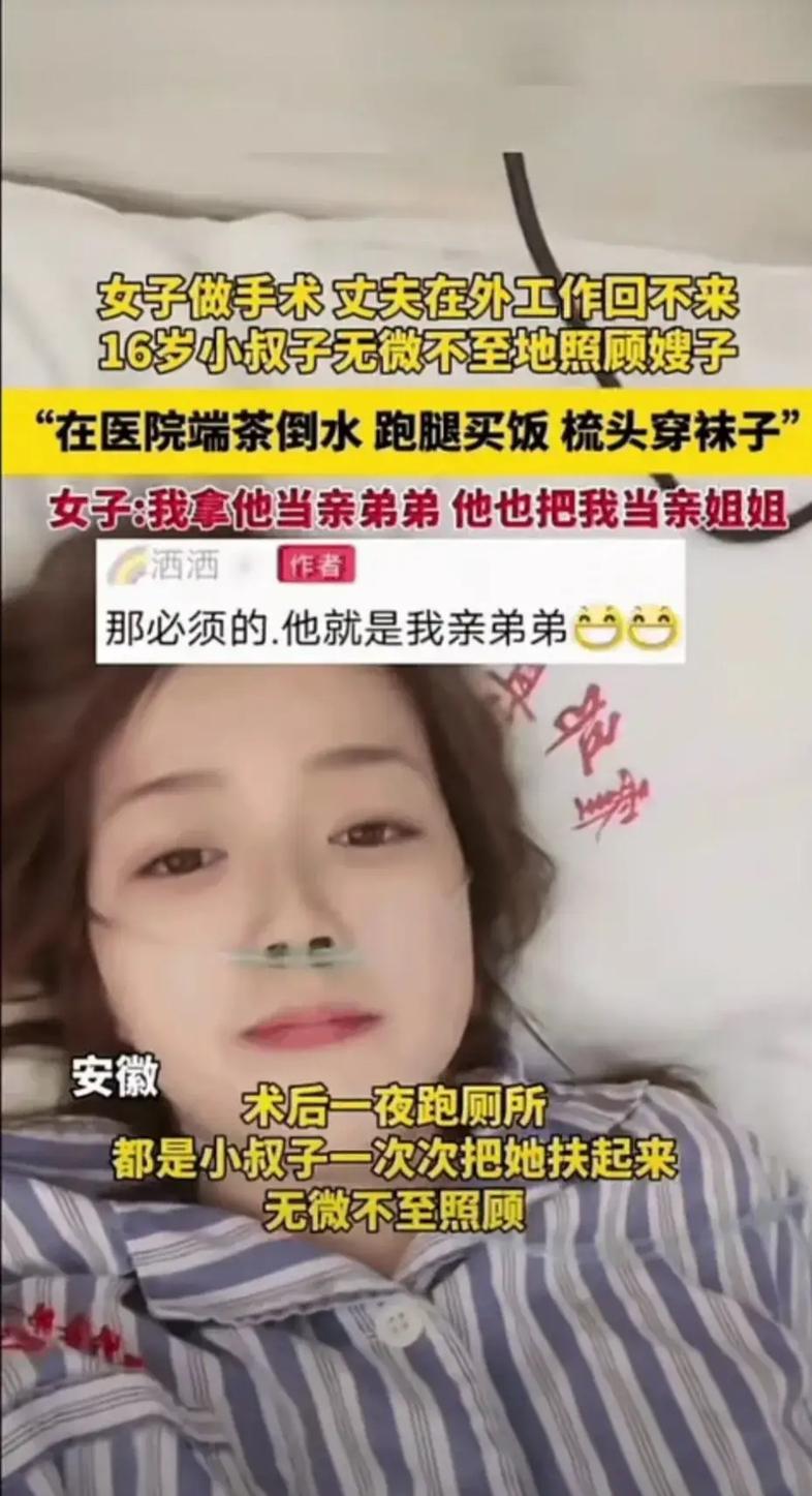 女子最近住院手术,丈夫在外地经商,却无法回来,16岁上高一的小叔子,早上天没亮就赶到医院,替不能起床的嫂子把头梳好,脸也帮嫂子洗好,还把煲好的粥也带给了嫂子。忙完这一切才去上学 。 谁能想到,一个16岁的半大孩子,能把照顾人的活儿做得这么周到!嫂子李女士刚做完腹部手术,躺在床上动弹不得,丈夫远在外地做建材生意,得知她手术的消息急得团团转,可手里的订单催得紧,根本抽不开身,只能一遍遍在电话里道歉,让妻子多担待。李女士挂了电话,心里难免有点委屈,看着病房里其他病友都有家人守着,自己身边连个搭把手的人都没有,忍不住红了眼眶。 她本来想请护工,可又觉得不放心,正当发愁的时候,病房门被轻轻推开了。门口站着的是小叔子小宇,身上还穿着校服,头发有点乱,眼睛里带着血丝,手里拎着一个保温桶和一个塑料袋。“嫂子,我来了!”小宇的声音还有点没睡醒的沙哑,放下东西就走到床边,小心翼翼地问,“你今天感觉怎么样?疼不疼?” 李女士看着他,心里一阵暖流涌上来,话都说不完整:“小宇,你怎么来了?这么早,你不用上学吗?”小宇一边打开保温桶,一边说:“我起得早,先去家里煲了粥,再过来照顾你,不会耽误上学的。”保温桶打开,一股淡淡的小米粥香味飘了出来,里面还卧了一个荷包蛋,旁边放着一小碟咸菜。 小宇先拿了毛巾,用温水浸湿,拧干后轻轻帮李女士擦脸。他的动作很轻,避开了她脸上的伤口,擦完脸又拿起梳子,慢慢帮她梳理头发。李女士的头发有点打结,小宇耐心地一点点解开,梳成一个简单的发髻,还特意找了个发绳固定好。“嫂子,这样会不会不舒服?”他时不时抬头问一句,眼里满是认真。 忙完这些,小宇端起粥,盛了一勺吹凉后,递到李女士嘴边:“嫂子,喝点粥,好消化。”李女士靠在床头,一口一口地喝着粥,心里暖暖的。这碗粥熬得软糯香甜,显然是花了心思的。她知道,小宇平时在家连自己的衣服都很少洗,现在却能把她照顾得这么周到,肯定是提前做了不少功课。 其实,小宇一直很感谢嫂子。他父母走得早,从小就跟着哥哥一起生活,哥哥外出经商后,都是嫂子照顾他的饮食起居。每天早上,嫂子都会提前给他做好早餐,晚上不管多晚,都会等他下晚自习回家,给他留一盏灯,有时候他学习遇到困难,嫂子还会耐心辅导他。小宇把这些都记在心里,得知嫂子手术,哥哥又不在家,他主动承担起了照顾嫂子的责任。 为了不耽误上学,小宇每天早上五点多就起床,先去菜市场买新鲜的小米和鸡蛋,回家煲好粥,然后带着粥赶到医院,帮嫂子洗漱、喂饭,忙完这一切,再急匆匆地赶往学校。晚上下晚自习后,他又会跑到医院,帮嫂子擦身、收拾病房,陪嫂子聊聊天,直到医院熄灯才回家。 有一次,李女士晚上突然肚子疼,小宇吓得赶紧去找医生,跑前跑后地拿药、倒水,一直守在床边,直到她疼痛缓解才放心。医生和护士看到这一幕,都忍不住夸小宇懂事:“现在这么懂事的孩子可不多见了,你嫂子没白疼你。”小宇不好意思地笑了笑:“这都是我应该做的,嫂子平时对我可好了。” 李女士的丈夫知道后,心里又感动又愧疚,在电话里哭着对小宇说:“弟弟,辛苦你了,等我忙完这边的事,马上回去陪你们。”小宇安慰他:“哥,你放心吧,我会照顾好嫂子的,你在外面注意身体。” 这件事在医院里传开后,很多病友都对小宇赞不绝口。有人说,现在的年轻人都很自私,很少有人能做到这样;还有人说,这就是亲情的力量,无关血缘,只要彼此真心相待,就能感受到温暖。小宇的班主任得知后,也特意表扬了他,还号召班里的同学向他学习。 小宇却觉得没什么,他说:“嫂子就像我妈妈一样,照顾她是应该的。”16岁的年纪,本该是无忧无虑、只顾着学习的年纪,可小宇却用自己的行动,诠释了什么是责任和担当。他没有惊天动地的事迹,只是用日复一日的陪伴和照顾,温暖着住院的嫂子,也感动着身边的每一个人。 亲情从来都不是单方面的付出,而是双向的奔赴。嫂子平时对小叔子的关爱,换来了他在关键时刻的挺身而出。在这个快节奏的社会里,很多人都忙于工作和生活,忽略了身边的亲情,可小宇的故事告诉我们,亲情是最珍贵的财富,只要彼此珍惜、相互扶持,就能战胜一切困难。 各位读者你们怎么看?欢迎在评论区讨论。