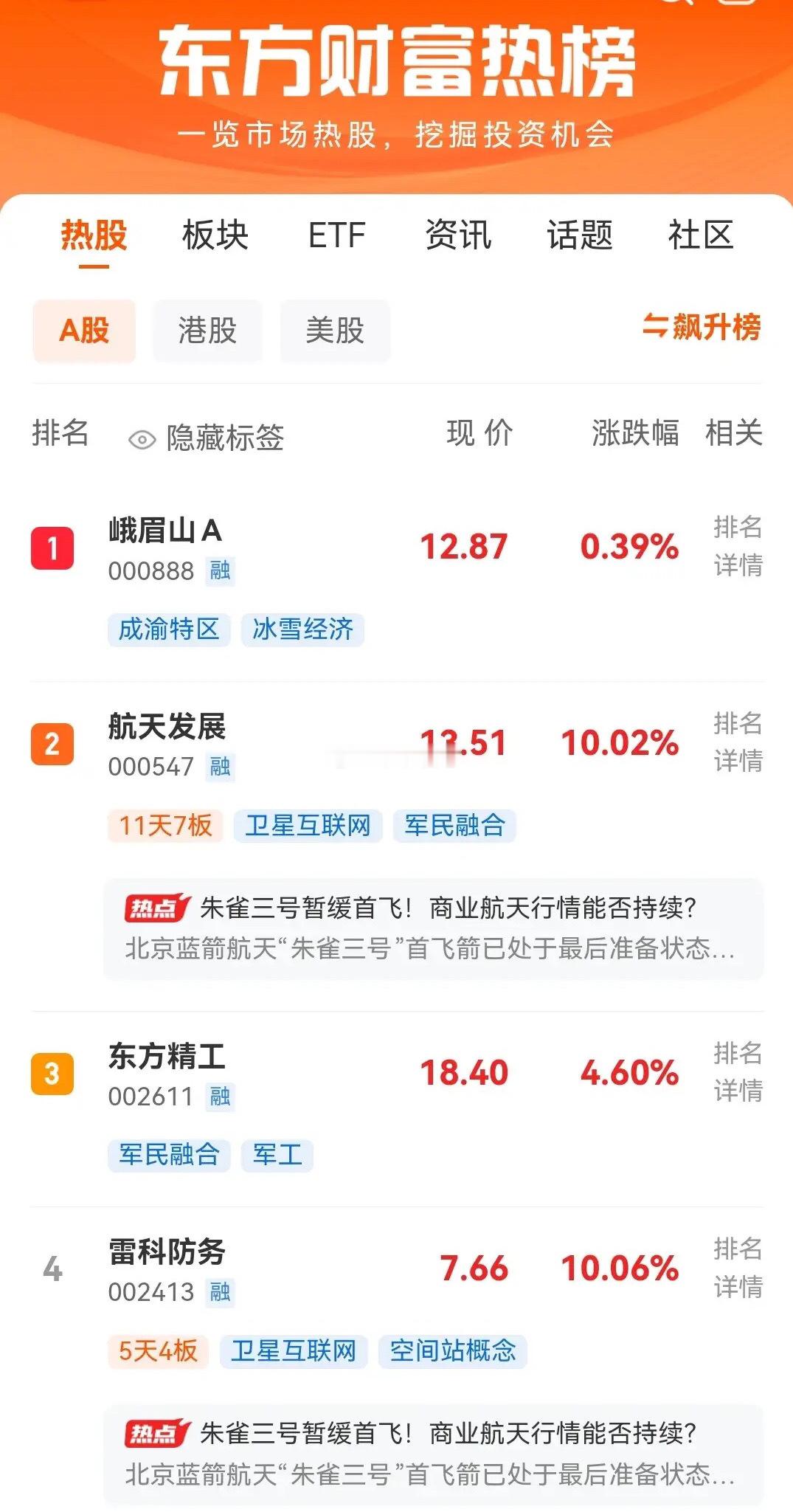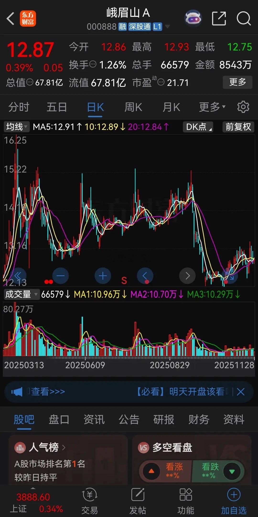 一觉醒来,峨眉山人气直接冲到了东财人气排行榜第一名!原因是公司发布了一条公告:持有公司500股股票即免景区和索道门票,还可享免费温泉、滑雪 住酒店打折等!随行亲属也有优惠。以峨眉山周五收盘的股价算,500股也就6000多元,一般散户都能买的起,这个优惠吸引力还是蛮大的。峨眉山之前人气排名三四千名,这一下子干到了第一名,要说这公司也是牛逼,没有热度,自己制造热度。再加上公司代码000888,比较靓丽,看来下周开盘又得炒作了。峨眉山这次是A股第一个吃螃蟹的,接下来,卖酒的,卖粽子的,卖车子,卖房子的等等会不会都跟着效仿呢?