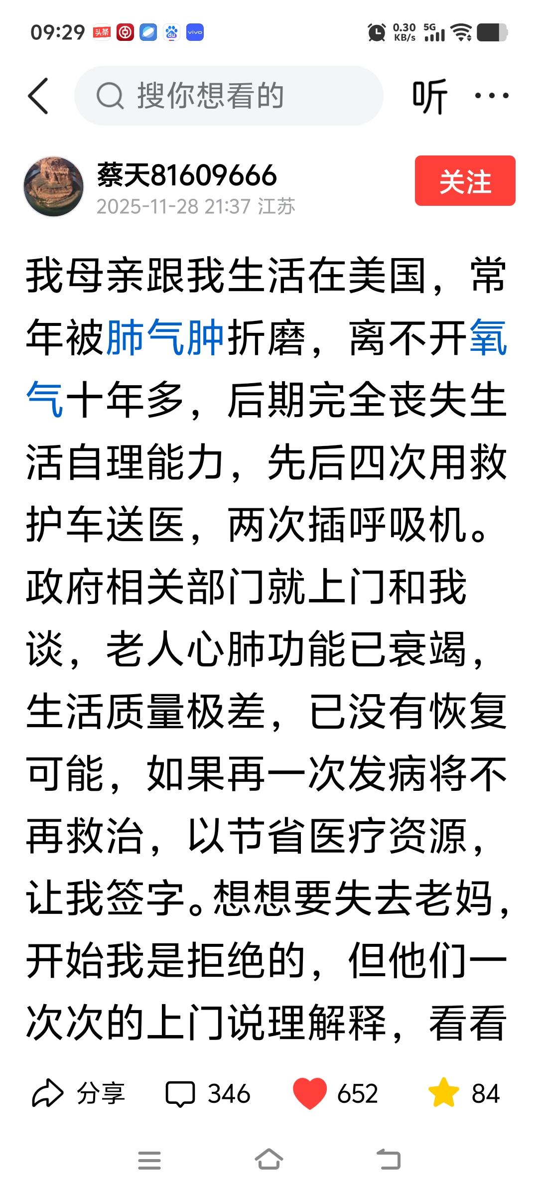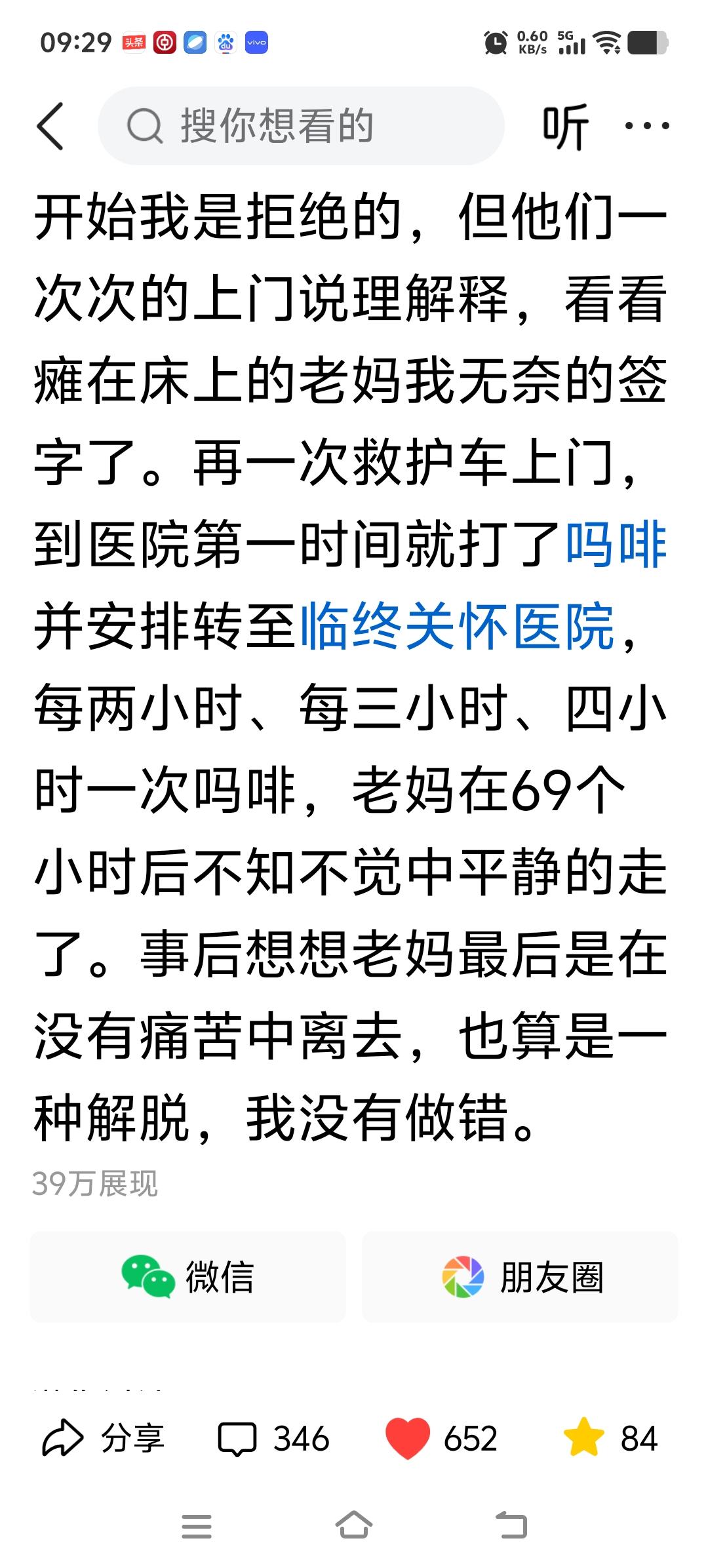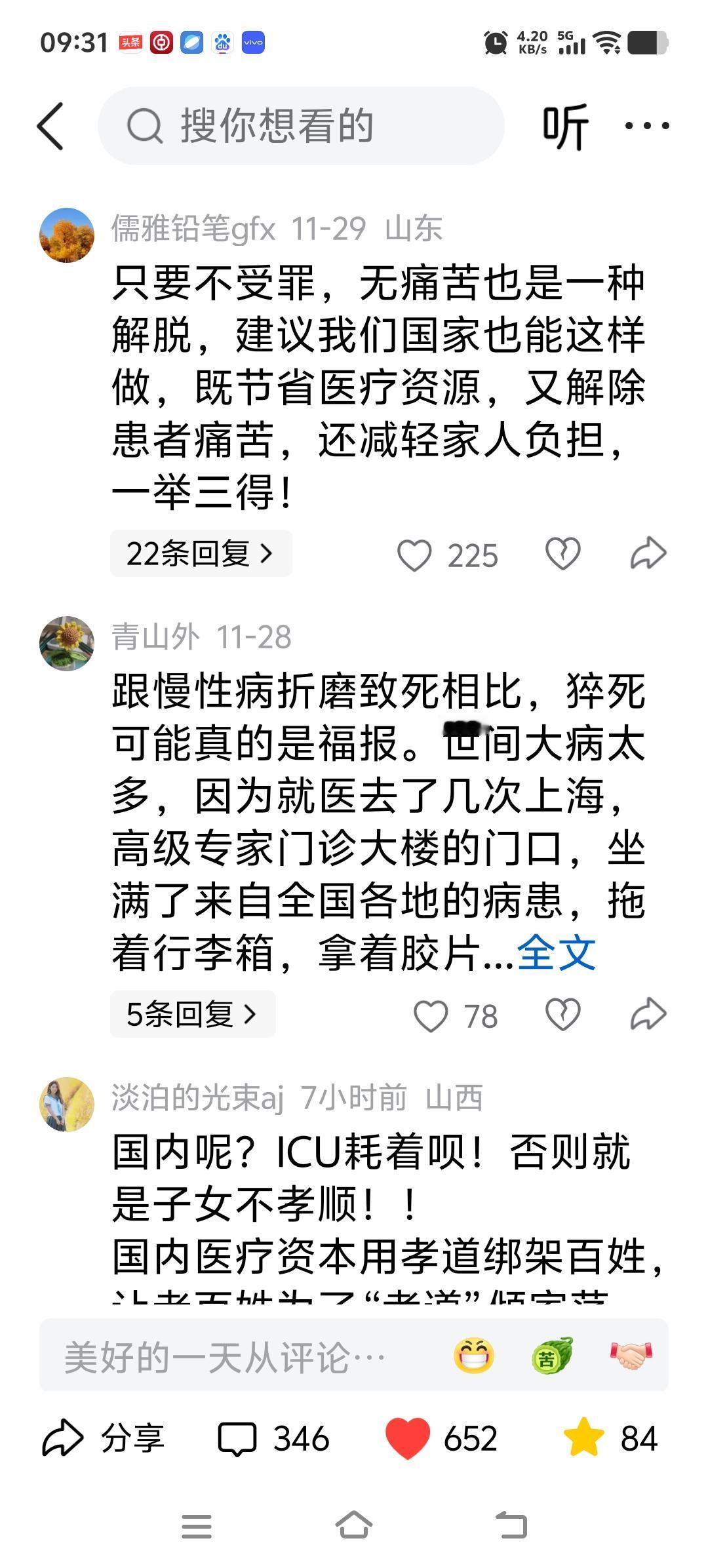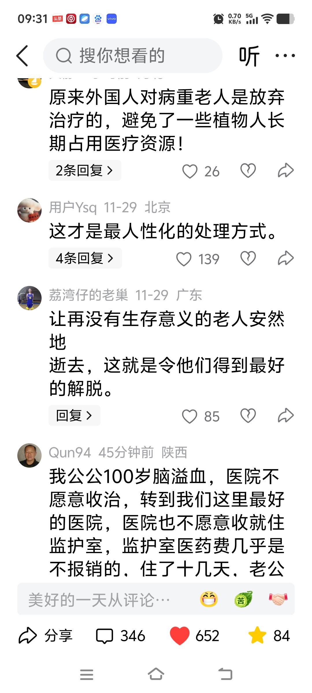今天终于理出一点头绪了,但是还是不怎么敢说出来。因为什么不敢说出来?我也不说。 有一位本家大哥77岁,半年前诊断为肺癌,他就回家调养,对外说把身体调整调整,然后做手术,然后就我行我素,绝口不提治疗,四天前突然晕倒,120送到就近医院的ICU ,住了三天一直用镇静剂各种仪器插管处于昏迷状态,然后医生告知没有任何希望,老婆和孩子决定拔管,家里的原则是,不惊扰任何人,一切,一切,一切都从简,他老婆自己给穿的,平时穿的衣服,打电话给火葬场的车拉走,第二天火化,自己家里带了一个盒子,连骨灰盒都没买,然后娘俩准备瞅机会倒进大海。也许是老大哥生前爱游泳,也许是自己的愿望,别人不得而知,也没有什么买墓地啊、上坟、烧纸、纪念、七七四十九天等等一些讲究,给人感觉干净利索。 老婆是大学毕业中学教师退休,儿子现在是国家干部,儿媳也是公职人员,这个家庭平时的待人处事接物也确实和平常人不一样,有人说缺心眼,有人说六亲不认冷漠,反正,做事总是超常规。 近几天总是在想他们的事,如果人得了大病,没有治愈的希望,甚至来日不多,倒不如讳疾忌医,省去很多麻烦和遭罪,免得搞得人心惶惶痛苦磨难疲惫不堪,至于火化、骨灰盒如何处理确实都不是事儿。 虽然是这么想,但是也怀疑自己的想法,总觉得和世俗的大众的做法不合拍,怕人谴责怕人笑话,直到今天看了头条的一篇文章,坚定了自己的观念。 文章的大意是,他母亲80多岁了,在美国,已经抢救了四次,上过两次呼吸机,然后政府部门找到他,告知治疗没有什么意义,劝他们不要再占公共资源了,再次发病应该放弃抢救。毕竟是中国人骨子里的传统,开始他当然不肯接受,后来人家反复做工作,迫不得已只好签字。他的心中很不安,道理能明白,观念不好理顺。 他母亲最后一次送医院抢救,就是打镇静剂,没有其他复杂的操作,几天以后(69小时)安详离世。 文章下面的留言,出乎我的意料,99%都赞成这种做法,呼吁我们的社会尽快调整改善自己的观念和认识,尤其在病人垂危没有治疗价值的前提下,让病人能安详的离开无疑是大孝是行善,为更需要治疗的、有治疗价值的病人腾出医疗资源,为医护人员更能专注地救治有治疗效果价值的病人,这更可称为舍己救人的善举。 生老病死人之常情,人生在世,从头到尾,每一个环节都值得认真理性思考,无法回避, 更不要为了所谓的“怕别人笑话” 绑架自己, 理性、务实 走好人生的每一步,特别是最后几步,想明白了,不难。