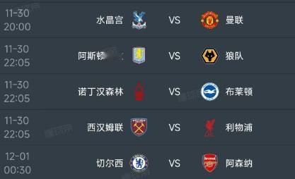 北京时间11月30日,英超第13轮剩下的赛程如下: 第一场20:00,水晶宫PK曼联:红魔上一场主场0-1不敌10人作战的埃弗顿,连续5场不败被终结,本轮的客场之行要专注,水晶宫目前以20分暂列第6名。 第二场22:05,阿斯顿维拉PK狼队:狼队难求一胜2平10负2分垫底 第三场22:05,诺丁汉森林PK布莱顿:森林目前的积分是12分,海鸥的积分是19分 第四场22:05,西汉姆联PK利物浦:红军已经陷入了泥潭,过去三场都是惨败,单场至少丢3球。英超过去7场比赛输掉了6场 第五场12月1日00:30,切尔西PK阿森纳:蓝军和枪手迎来强强对决,枪手盼巩固榜首