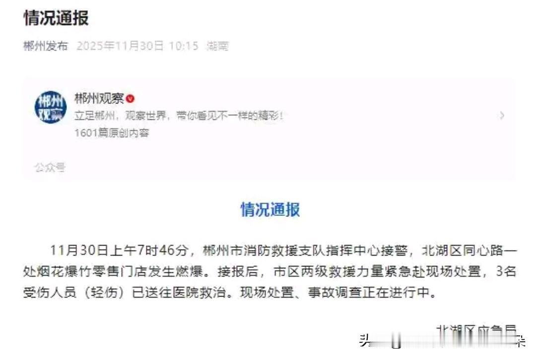 11月30日 07:46,郴州市北湖区同心路一处烟花爆竹零售门店发生燃爆。市区两级救援力量已到场处置,3名受伤人员(轻伤)送医救治;现场处置与事故调查正在进行中。 现场与救援 接警后,消防等部门迅速开展处置与警戒,周边人员被有序疏散;媒体发布的现场视频显示,有车辆被炸飞,周边部分设施受损,具体财产损失以官方后续通报为准。 权威信息渠道 后续进展以北湖区应急局与“郴州发布”权威通报为准;建议公众不信谣、不传谣,避免靠近事发现场,注意出行安全。 安全提醒 - 烟花爆竹属易燃易爆物品,务必通过正规渠道购买,并远离火源与高温。 - 存放应置于通风、干燥、远离人群的地点,切勿大量囤积。 - 发现非法储存或销售,请及时向应急管理部门或公安机关举报。