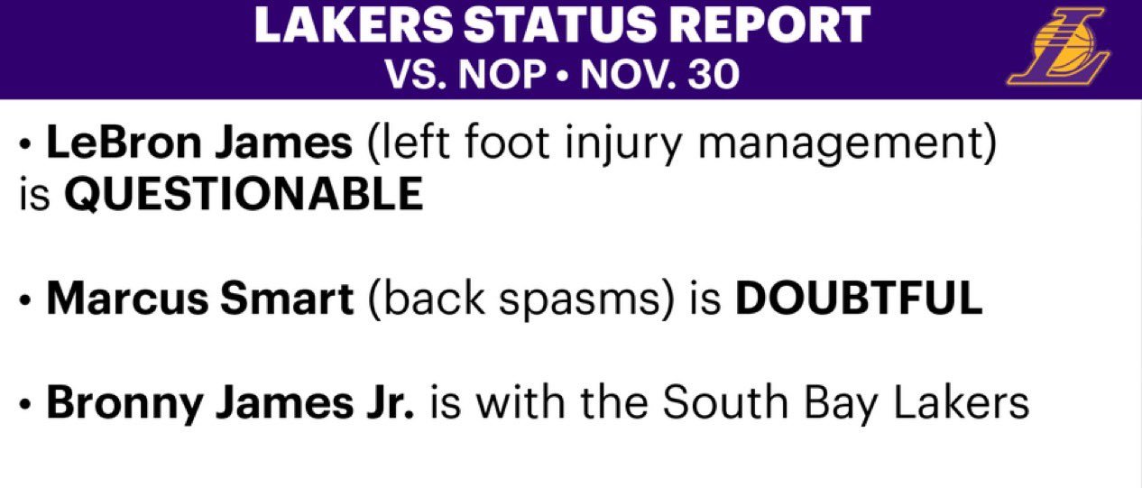 明天对阵鹈鹕:詹姆斯(左脚伤病管理)出战成疑,斯玛特(背部痉挛)小概率出战,布朗尼随南湾湖人比赛。