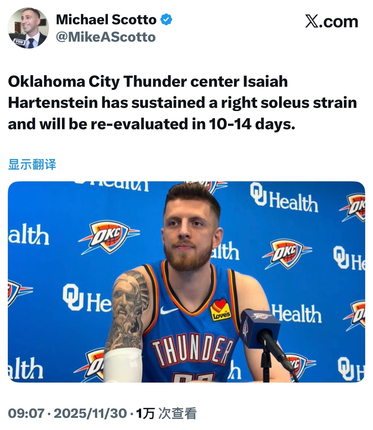 雷霆中锋哈滕斯泰因右腿比目鱼肌拉伤,将在 10-14 天后接受重新评估。