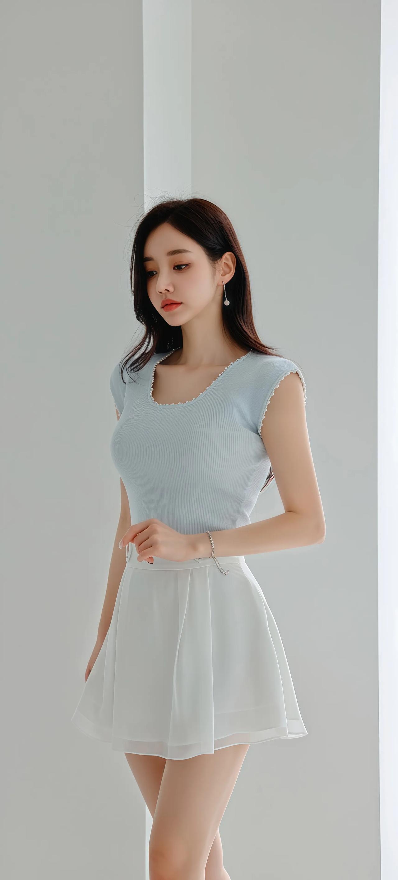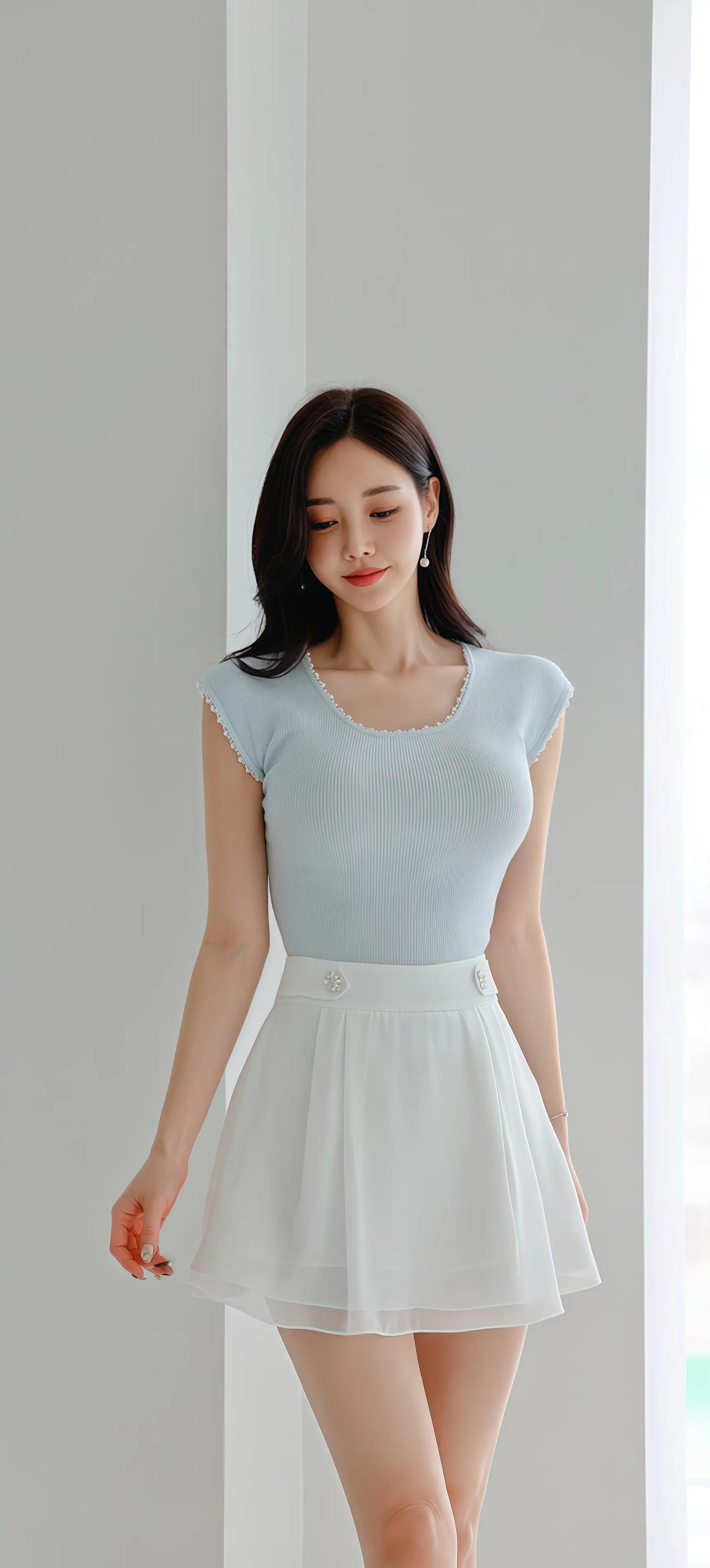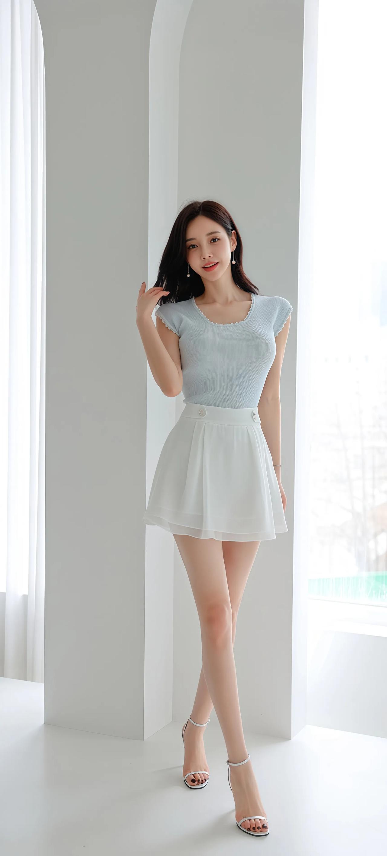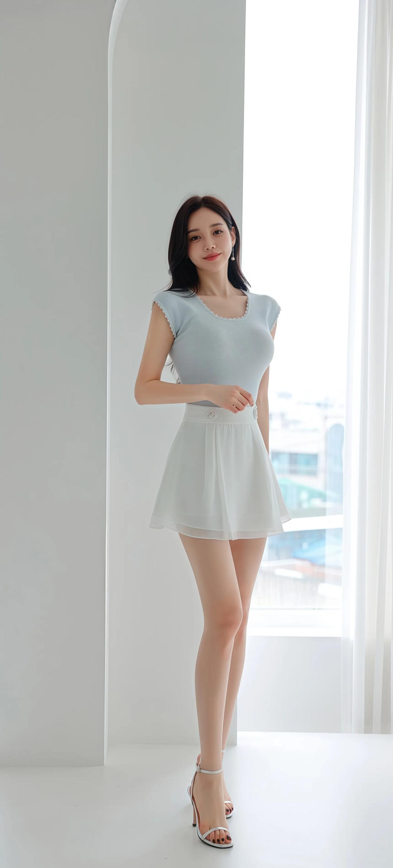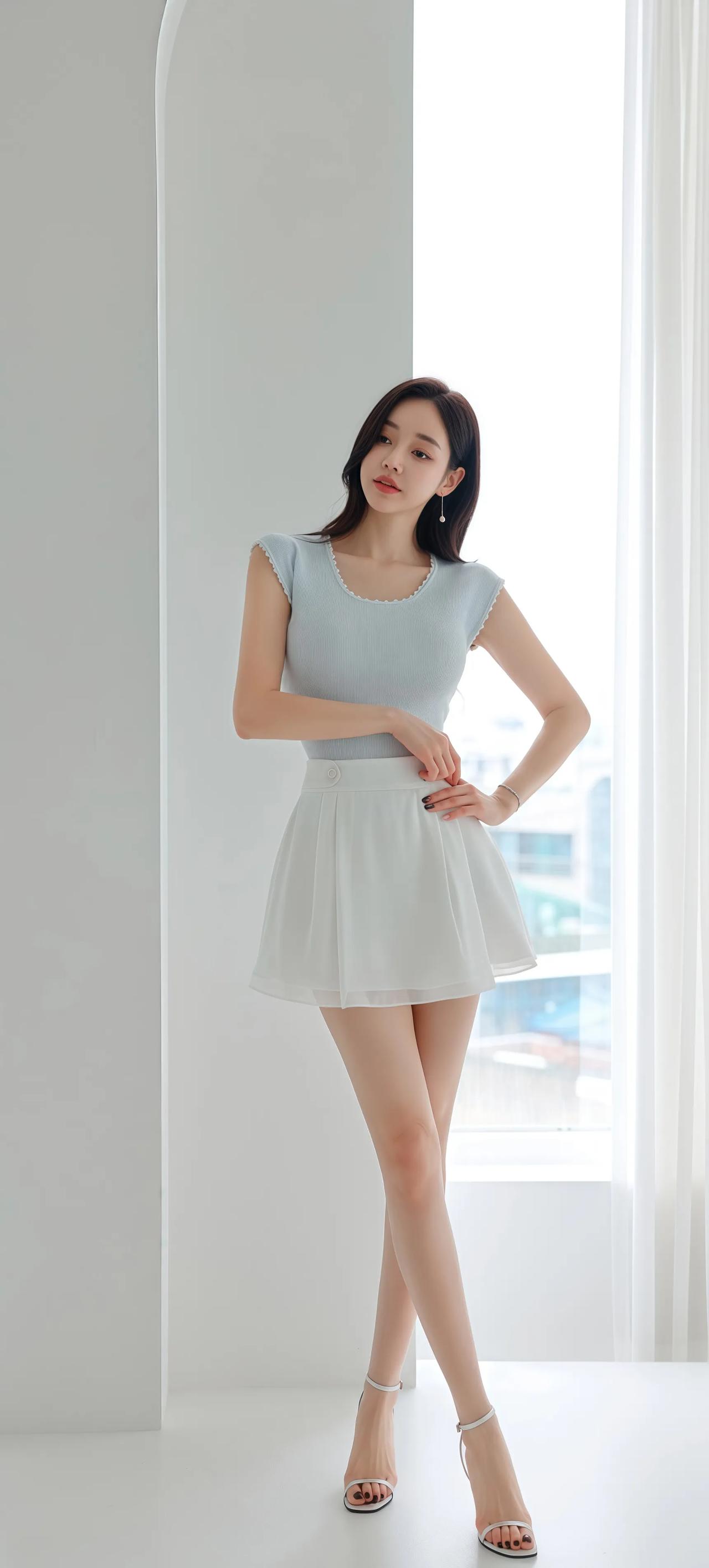 清新夏日穿搭,浅蓝色连衣裙搭配白色凉鞋,优雅动人。