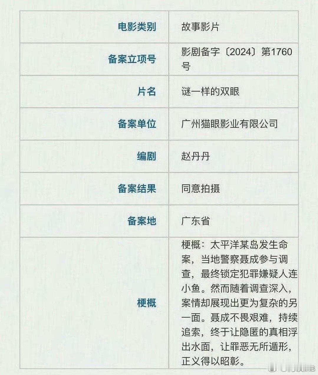 电影《谜一样的双眼》12.3杀青,2026敬请期待主演:倪妮、陈飞宇梗概:太平洋某岛发生命案,当地警察聂成(陈飞宇 饰)参与调查,最终锁定犯罪嫌疑人连小鱼。然而随着调查深入,案情却展现出更为复杂的另一面。聂成不畏艰难,持续追索,终于让隐匿的真相浮出水面,让罪恶无所遁形,正义得以昭彰