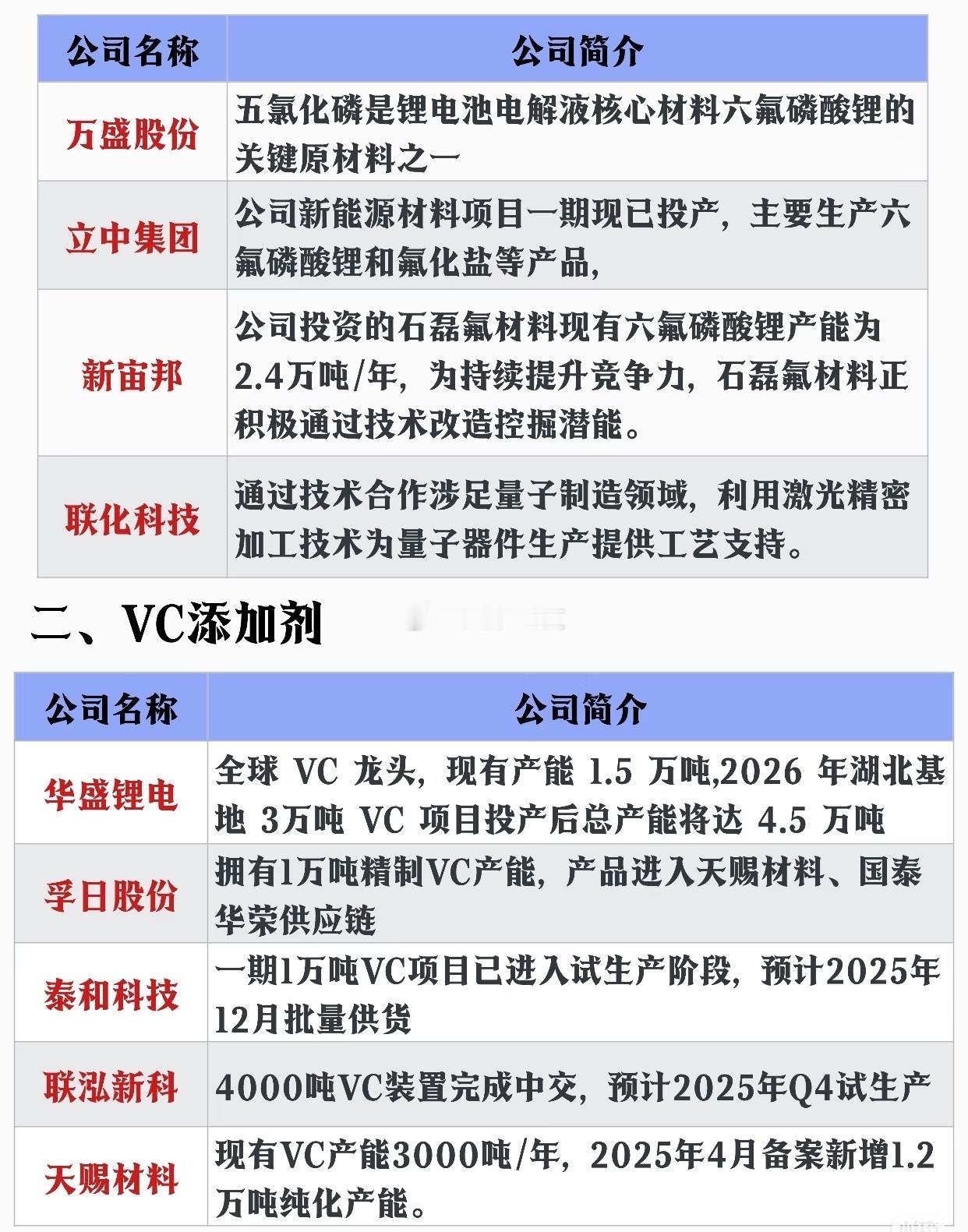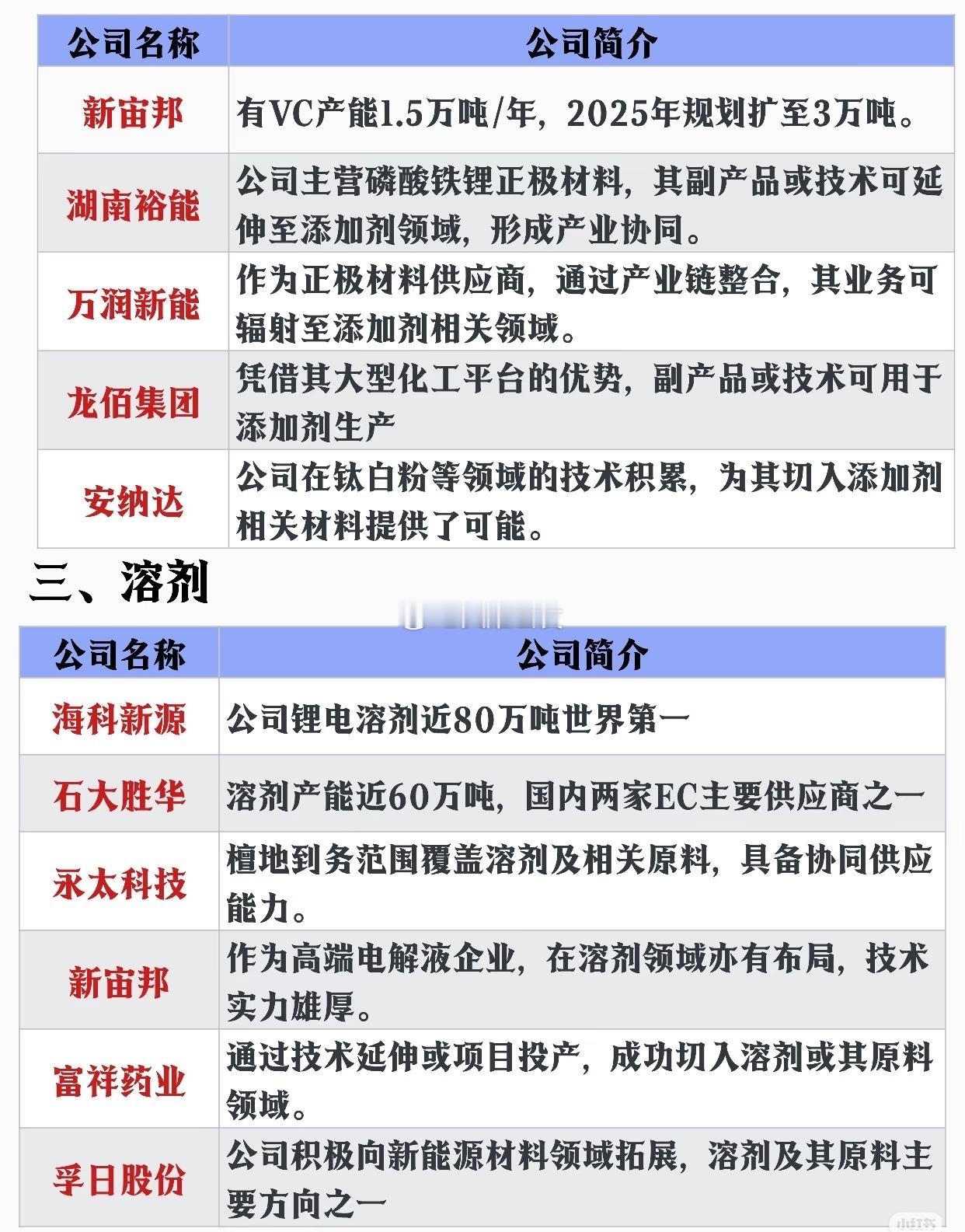 电解液核心材料产业链全景图一、六氟磷酸锂(核心溶质)$天赐材料 sz002709$ :全球电解液龙头,实现六氟磷酸锂全产业链布局$多氟多 sz002407$ :国内传统龙头,技术积累深厚$永太科技 sz002326$ :横向布局多种锂盐,产品矩阵丰富二、电解液添加剂华盛锂电:全球VC龙头,产能从1.5万吨扩至2026年4.5万吨新宙邦:现有产能1.5万吨,2025年规划达3万吨天赐材料:现有3000吨,规划新增1.2万吨纯化产能新进入者:孚日股份、泰和科技等企业已完成供应链认证三、电解液溶剂海科新源:全球产能第一,总产能近80万吨石大胜华:国内EC主要供应商,产能近60万吨配套企业:永太科技、新宙邦等具备原料供应能力四、产业链延伸布局上游材料:万盛股份、立中集团布局六氟磷酸锂关键原料正极企业:湖南裕能、万润新能通过协同效应切入添加剂领域跨界布局:富祥药业、孚日股份等拓展至新能源溶剂领域以上信息为公开资料整理,不构成任何投资建议。