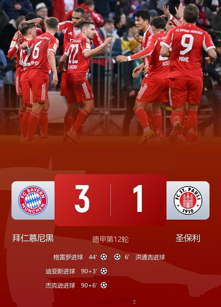 12轮不败!拜仁补时阶段3-1逆转圣保利足球体育 11月30日讯 北京时间11月29日晚22时30分,2025-26赛季德甲第12轮在安联竞技场展开角逐,拜仁慕尼黑主场迎战圣保利。上半场洪通吉6分钟首开记录+伤退,莱默尔后场被断,卡尔和比朔夫中柱,格雷罗扳平比分,迪亚斯倒地助攻,下半场凯恩中柱,迪亚斯和杰克逊补时连入2球反超。最终拜仁主场3-1逆转圣保利,拜仁联赛12轮不败+8分优势领跑。拜仁主场丢球!第6分钟,莱默尔后场停球失误被断,拉格直塞,金玟哉转身后被生吃,洪通吉杀入禁区推射近角得手,丢球后诺伊尔非常不满!拜仁0-1圣保利!拜仁扳平!格雷罗破门,迪亚斯倒地助攻!第44分钟,金玟哉送出精准长传,迪亚斯禁区内倒地完成做球,格雷罗顺势撩射破门,拜仁1-1圣保利!拜仁补时反超!迪亚斯本场传射,基米希传中助攻!第90+3分钟,基米希右路传中落点精准,迪亚斯包抄抢点头球破门,拜仁2-1圣保利!拜仁锁定胜局!杰克逊破门!第90+7分钟,格纳布里中场积极上抢断球,杰克逊单刀轻松推射破门,通过VAR,裁判吹罚进球有效,拜仁3-1圣保利!