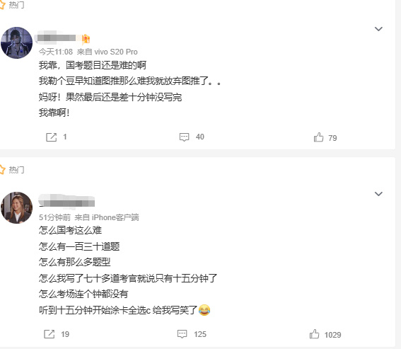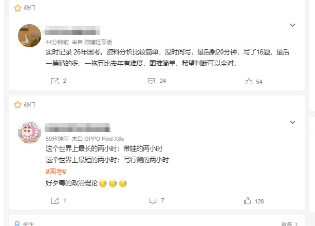 【国考行测被难字刷屏】今天上午,2026年国家公务员考试公共科目笔试在全国各地同时举行。此次国考共有20714个招录职位计划招录38119人。截至报名结束,共有371.8万人通过了用人单位的资格审查,通过资格审查人数与录用计划数之比约为98:1,创下历史新高。上午考试结束后,多个国考相关词条登上热搜,不少网友直呼时间不够用、太难了!你觉得今年国考行测题难吗?一来来聊聊!行测