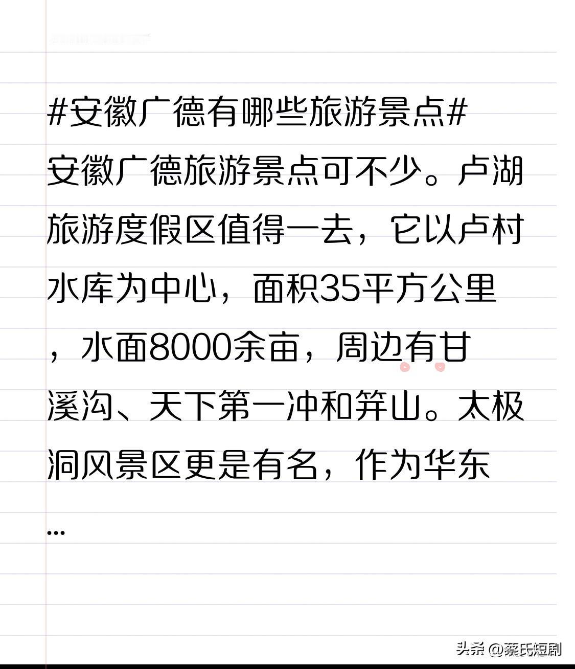 安徽广德旅游景点可不少。卢湖旅游度假区值得一去,它以卢村水库为中心,面积35平方公里,水面8000余亩,周边有甘溪沟、天下第一冲和笄山。太极洞风景区更是有名,作为华东最大天然溶洞,有“天下第一洞”美誉,还是国家首批4A级景区。 桃姑迷宫又名东崖洞,总面积31万平方米,有流云、怪石、奇门和幽峡四绝。茅田山风景区由茅田山、梓冲水库、响水滩瀑布三部分组成。 此外,还有一些另类打卡点,比如废弃的运煤火车站,被老板改造后供人拍照,虽没正式景点名分,但光影效果绝美,花35元以喝咖啡之名就能进入打卡。