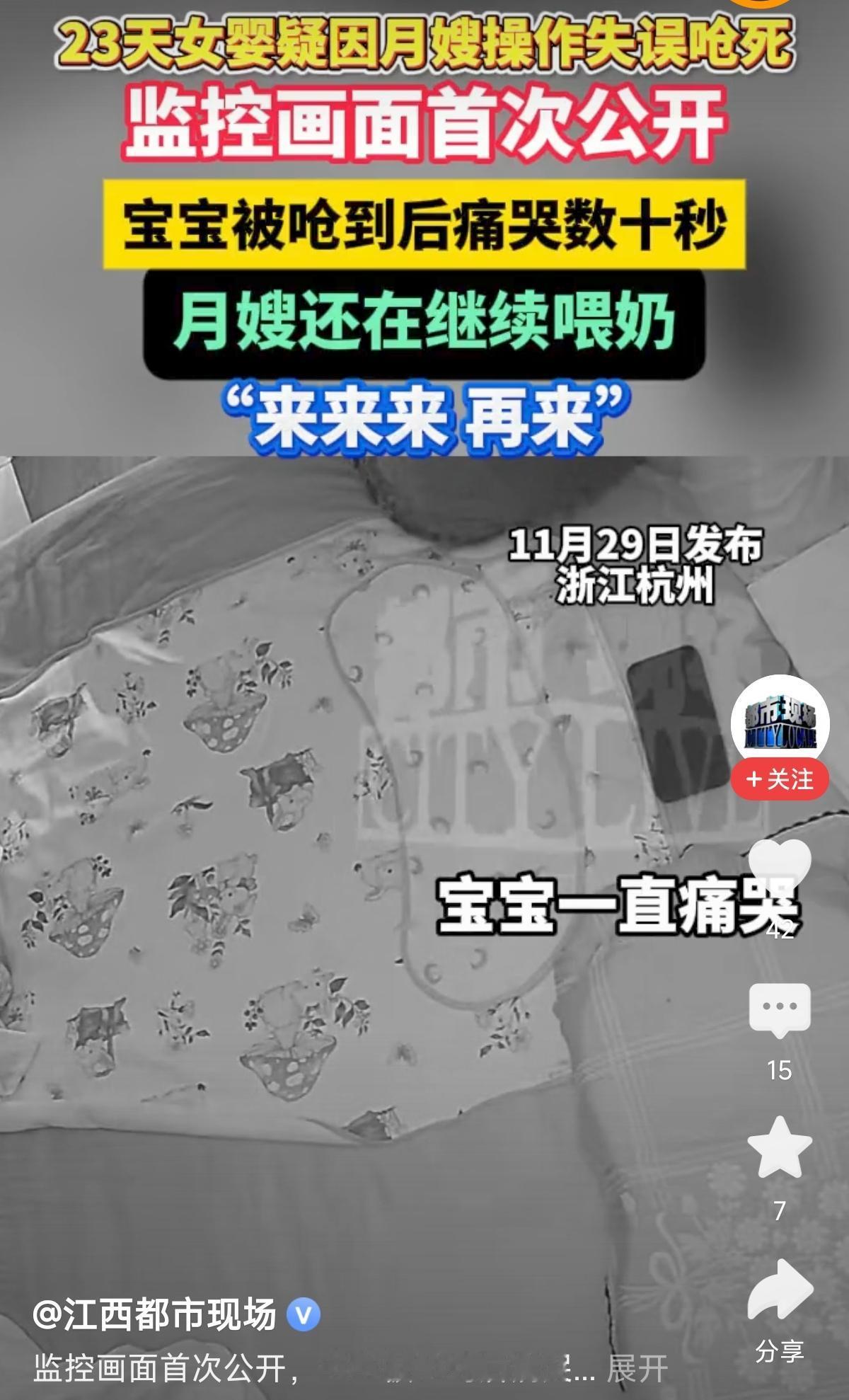 父母发声刚刚出生才23天的宝宝,还没来得及看看世界的美好,却在月嫂喂奶时被呛死了!监控视频流出:女婴呛奶后月嫂未及时处理致窒息。这谁能接受?父母崩溃发声,月嫂却说"按标准操作",标准就是让宝宝命丧黄泉吗?月嫂行业乱象已久,多少人拿着几千块高薪却连基本育儿常识都没有?花钱请专业月嫂,结果却是花钱买罪受!可怜天下父母心,失去孩子的痛,谁能懂?相关部门该出手整顿了,别让更多家庭重蹈覆辙!女婴事故 喂奶急救 幼儿窒息 月嫂 婴儿