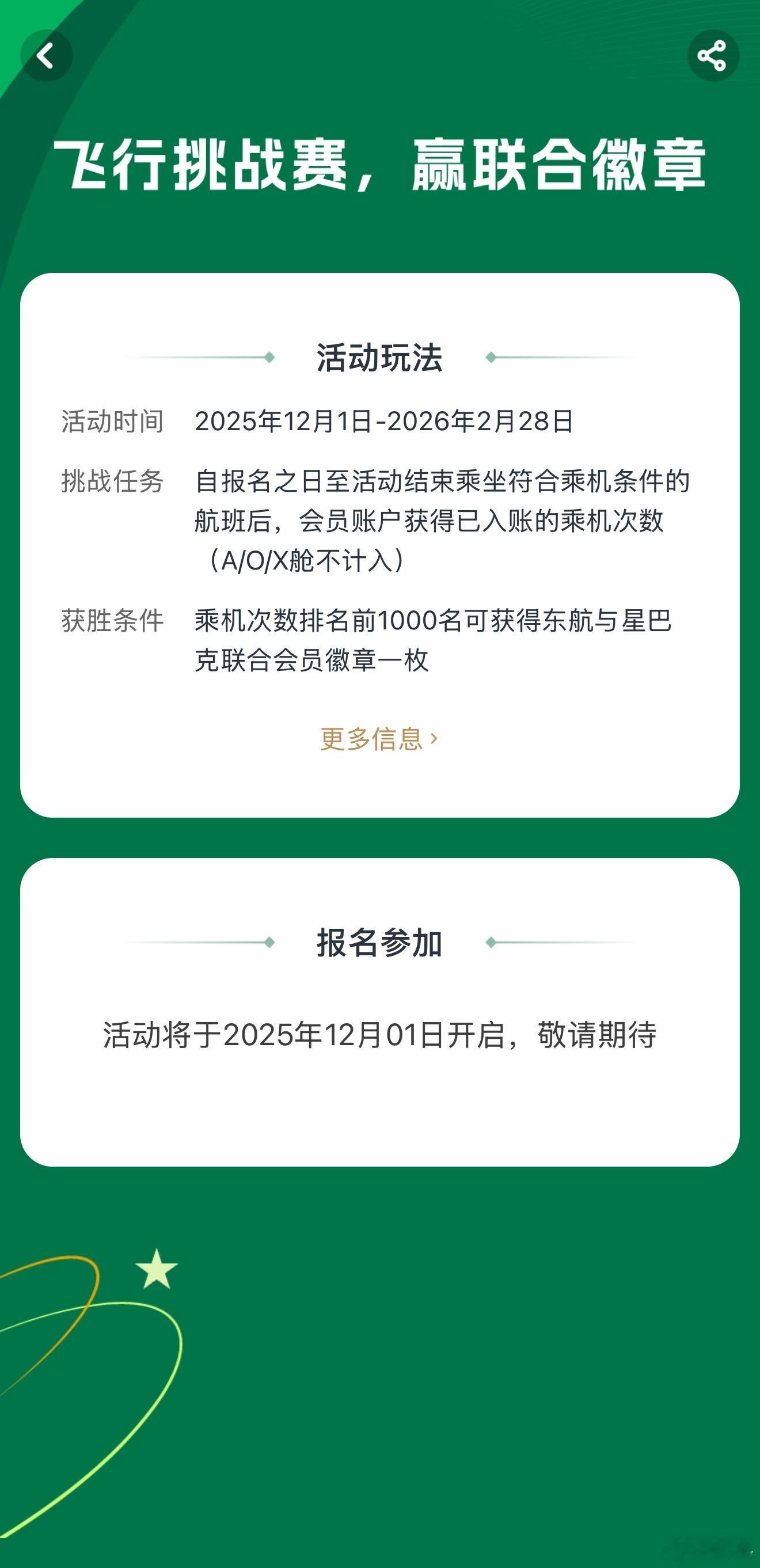 不出意外的话。东航×星巴克的联名活动,下个月不仅要续期,而且还加码搞了个飞行挑战赛。下个月的星巴克看来东航是要继续包了,至于飞行挑战赛,乘机次数前1000名,上海一堆白金卡,感觉难度有点大啊………