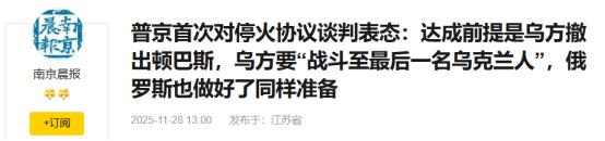 普京首次对停火协议谈判表态!2025年11月27日,俄罗斯总统普京直言:达成协议的前提是乌克兰方面撤出顿巴斯!而乌克兰方面称“战斗至最后一名乌克兰人”,俄罗斯也做好了同样的准备!   从2022年爆发截止到当下,俄乌冲突已经经历了多个阶段,目前的俄乌冲突已经进入了僵局。近期俄乌冲突的走向同美国脱离不了关系,美国现任总统特朗普就职之后,就针对俄乌冲突采取了很多措施。   就在近日,在美国的介入下俄乌进行了停火协议谈判。俄乌停火协议谈判备受国际的高度关注,就在2025年11月27日的时候,俄罗斯总统普京首次针对这场谈判进行了表态。   在表态的过程中,普京的态度非常强硬,他格外强调了美国提出的“乌克兰问题清单”中考虑到了俄罗斯的立场,而在未来的协议中,很有可能就是基础,但是仍旧有很多工作要做。   在谈及领土问题的时候,普京格外发出警告,指出乌克兰必须撤出已经占领的领土,冲突才能够有可能停止。   同时他更是谈及乌克兰方面方面有表态,想要让这场战争战斗到最后一名乌克兰人。针对乌克兰的这一举动,俄罗斯方面则做好了同样的准备。   针对俄乌冲突,普京格外发出警告称,俄罗斯如果继续以目前的速度进行推进,乌克兰的防御系统可能会彻底崩溃。   在历经三年的战争之后,乌克兰已经面临了很大的困境,尤其是国内的防御系统更是逐步走向了崩溃。   所以对于当下的乌克兰来说,或许接受现在俄罗斯提出的条件是最好的选择。如果继续同俄罗斯战斗下去,乌克兰将会付出更加惨痛的代价。   对此,您怎么看?欢迎评论区留言您的看法。 (信息来源:普京首次对停火协议谈判表态:达成前提是乌方撤出顿巴斯,乌方要“战斗至最后一名乌克兰人”,俄罗斯也做好了同样准备 -南京晨报)