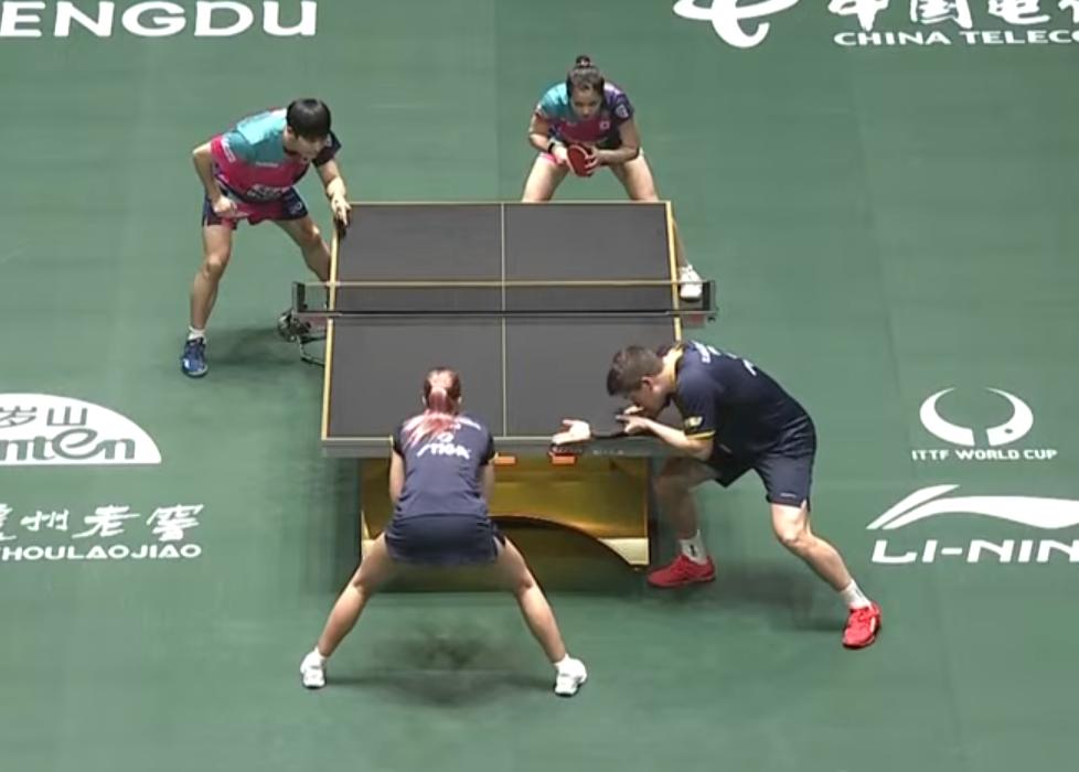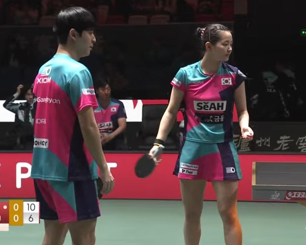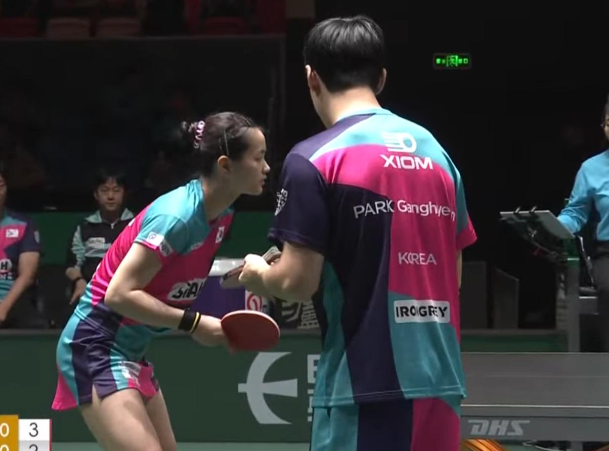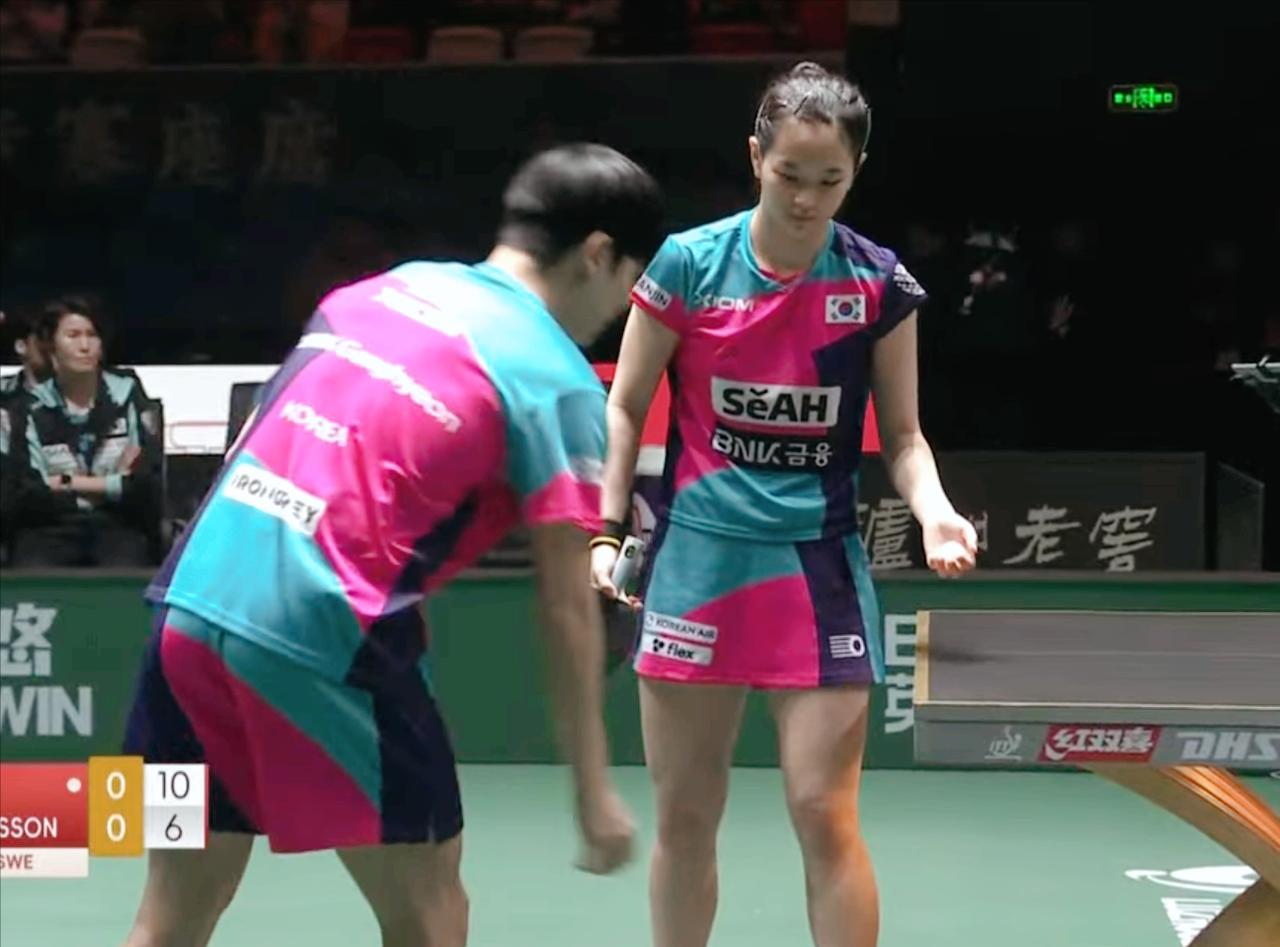 我真没想到,韩国混双会让金娜英配朴康贤打, 韩国混双一直是申裕斌和林钟勋, 但是今天正好是林钟勋结婚的日子, 肯定来不了了。 有了赵大成的失败教训, 看来申裕斌不愿意和别人配混双。 金娜英打混双真不多, 但是他和小朱打女双比较多, 配合意识还是有的。 小朱作为韩国二号选手, 原籍山东潍坊诸城, 今年还不能打升国旗的比赛, 明年就可以了, 所以只能金娜英顶上了。 金娜英长着一张萝莉脸, 但是身高175, 护台很广, 第一局11:6拿下。