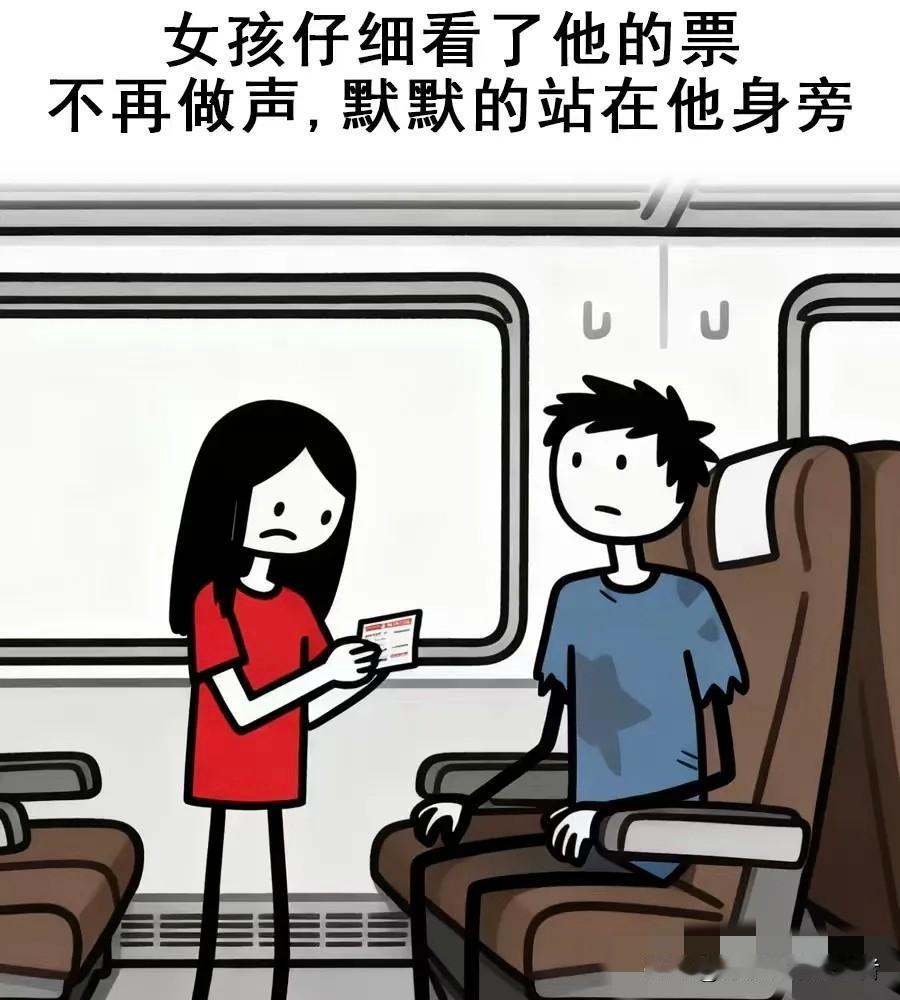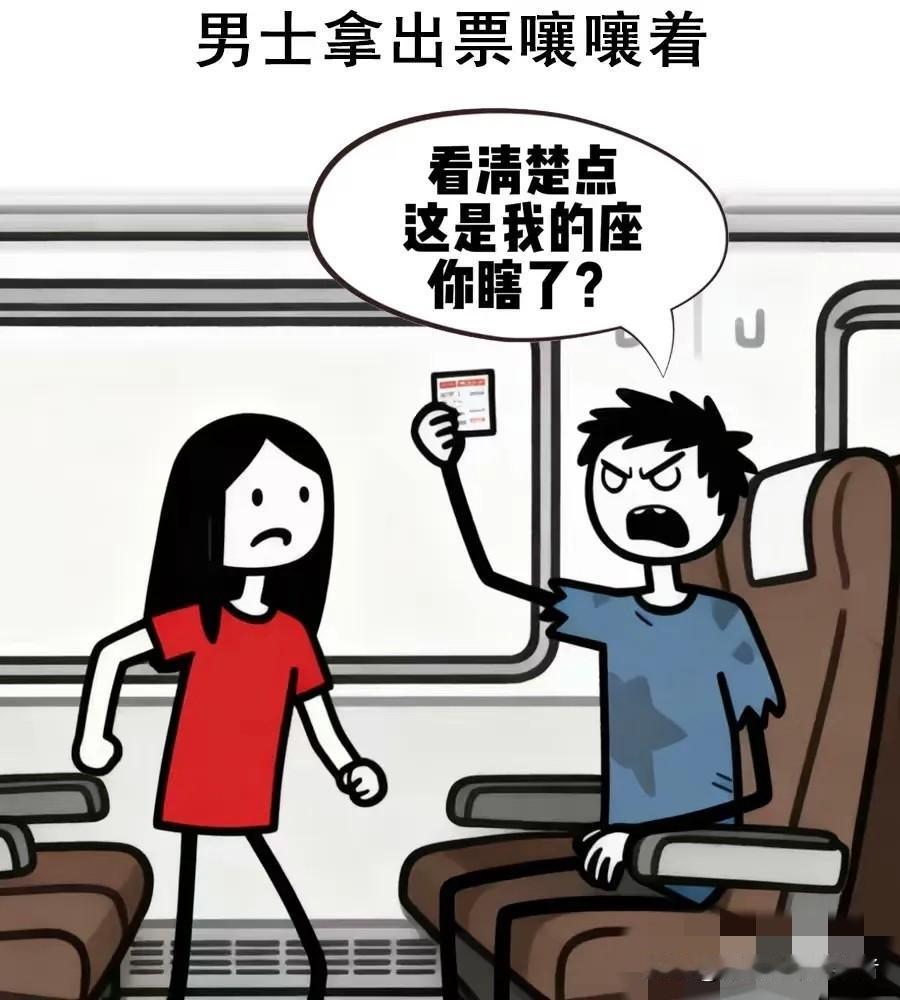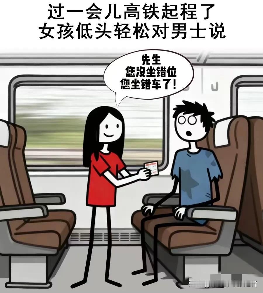 趣味漫画:一姑娘上了高铁,见自己的座位坐着一男士,她说:先生,您坐错位置了,男士:这是我的座,你瞎了,一会儿高铁起程,女孩说:您坐错车了