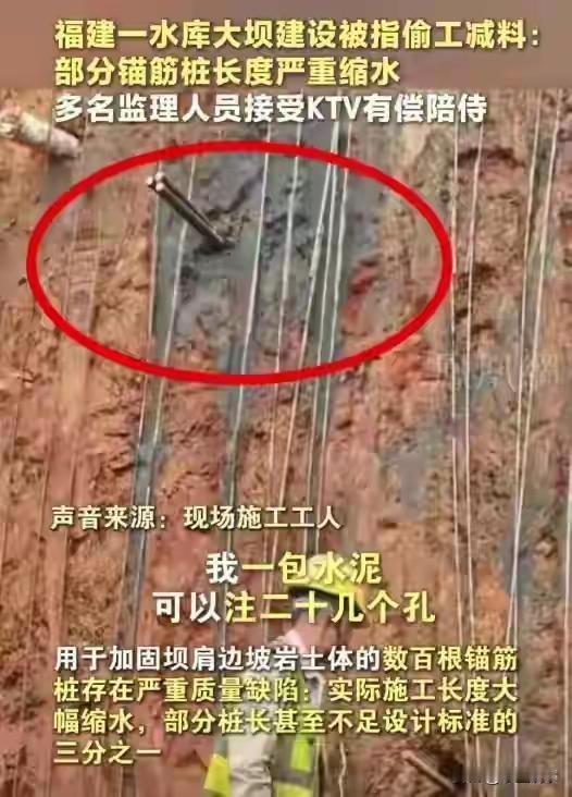 福建75亿水库大坝惊现“豆腐渣”工程!锚筋桩长度缩水七成,监理与施工方KTV狂欢画面曝光,下游数万居民安危悬于一线! 当一座总投资75亿元、号称能抵御200年一遇洪水的水库大坝,被揭开偷工减料的黑幕时,我们看到的不仅是冰冷的钢筋水泥,更是无数家庭在灾难面前的脆弱与无助。近日,福建永安抽水蓄能电站项目被曝出触目惊心的质量隐患——设计12米的锚筋桩竟被偷工减料至不足3米,监理人员与施工方推杯换盏、KTV狂欢的画面更是刺痛了公众的神经。 记者深入施工现场发现,工人们徒手将两根短钢筋插入孔洞,长度仅约两米,与设计图纸上12米的标准相差甚远。一名工人坦言:“焊钢筋太麻烦,一天只能焊一两根,干脆简单化了。”更令人愤慨的是,多数锚筋桩连水泥砂浆灌注都被省略,仅用孔口封浆伪装达标。水利专家警告:坝肩锚筋桩如同大坝的“筋骨”,一旦偷工减料,整座大坝将沦为随时崩塌的“定时炸弹”。 监理单位的失守让这场闹剧走向荒诞。浙江华东工程咨询有限公司的监理人员,本该是工程质量的“守门人”,却被拍到在KTV接受施工方宴请,身旁还有有偿陪侍人员。当监督者与施工方觥筹交错,谁还能为下游百姓的生命安全驻守底线?更讽刺的是,设计、施工、监理三方竟同属中国电建旗下,这种“既当运动员又当裁判”的模式,早已为今日的乱象埋下伏笔。 回溯今年8月,该电站边坡就曾因锚筋桩问题发生坍塌,但警告未能换来整改。如今,千余根锚筋桩中约70%被工人指认为“残次品”,锤子轻敲便松动脱落。若真如施工方所言“仅30%符合标准”,这座大坝如何承载12.6亿千瓦时的发电使命?又如何守护下游城镇免受洪水侵袭? 永安市水利局已成立调查组介入,但公众的疑虑远未消散:从8月问题暴露到11月底才启动调查,三个月的“迟来的正义”背后,是否有人试图掩盖真相?当75亿元投资与数万人的生命安全被放在天平两端,偷工减料省下的水泥钢筋,真的比人命更重吗? 中国电建宣称“全面调查核实”,但民众要的不只是承诺。我们需要看到每一根锚筋桩被重新测量,每一个责任人被依法追责,每一份报告在阳光下公开。毕竟,大坝之下,没有人是孤岛。 (来源:每日经济新闻综合自经济参考报、极目新闻、中国电建通报) 水库安全 工程腐败