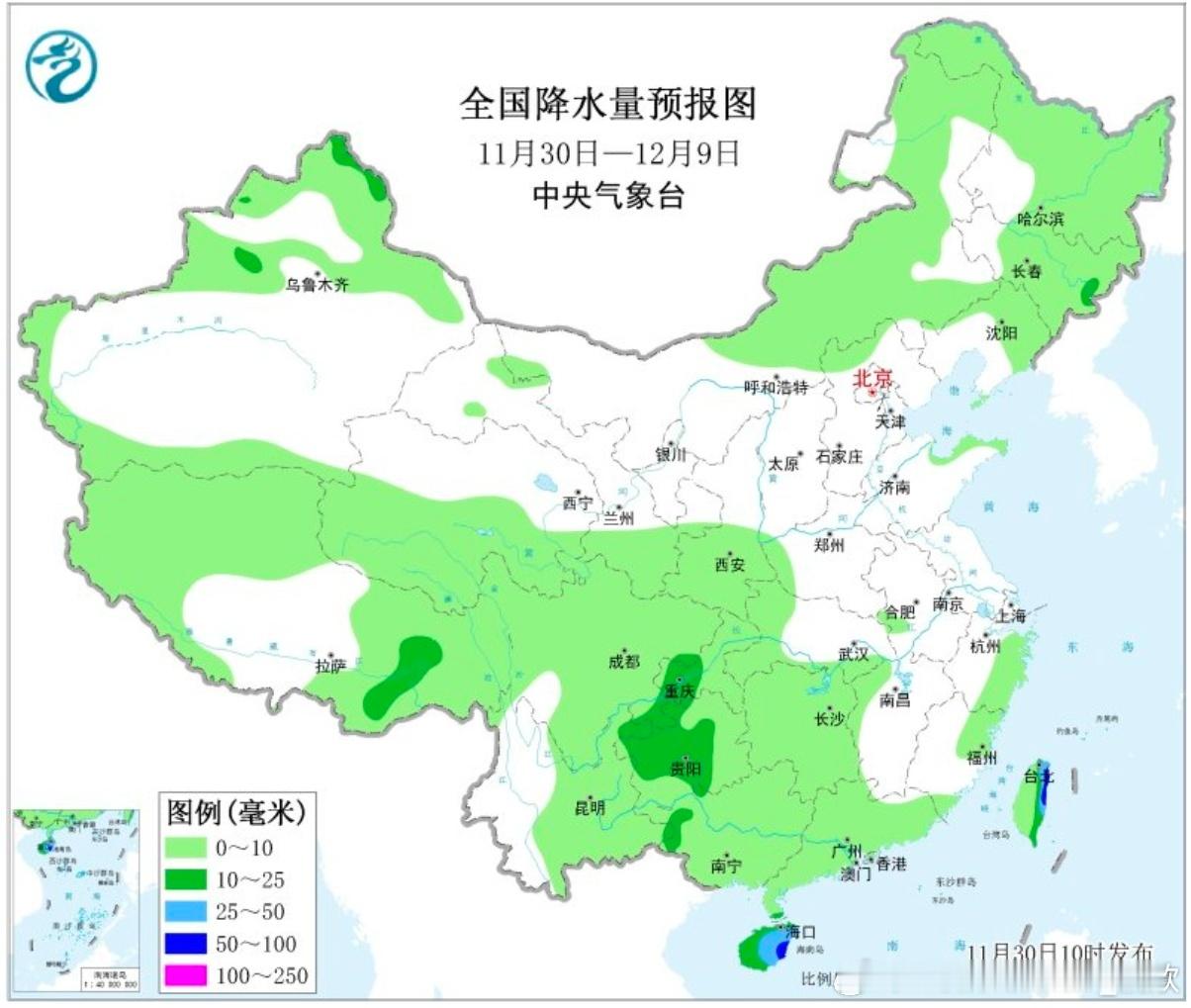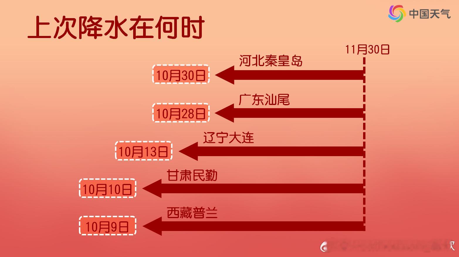 【11月降水交白卷】今年11月以来,我国大多数地区降水偏少,甚至有些站点降水量为0。比如新疆和田、库尔勒、吐鲁番、甘肃酒泉、宁夏中卫、河北承德、秦皇岛、辽宁朝阳、葫芦岛、大连、广东汕尾。广东汕尾上次出现0.1毫米以上降水还是10月28日。今后10天西南和华南可能有些弱降水。