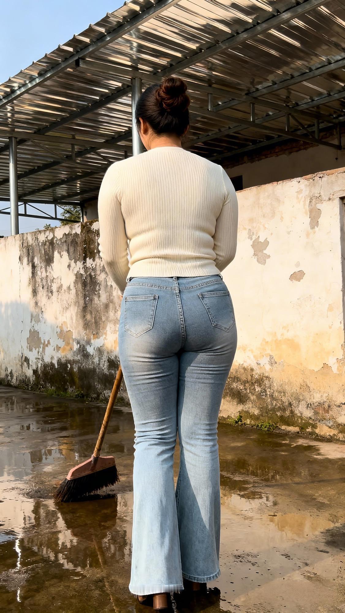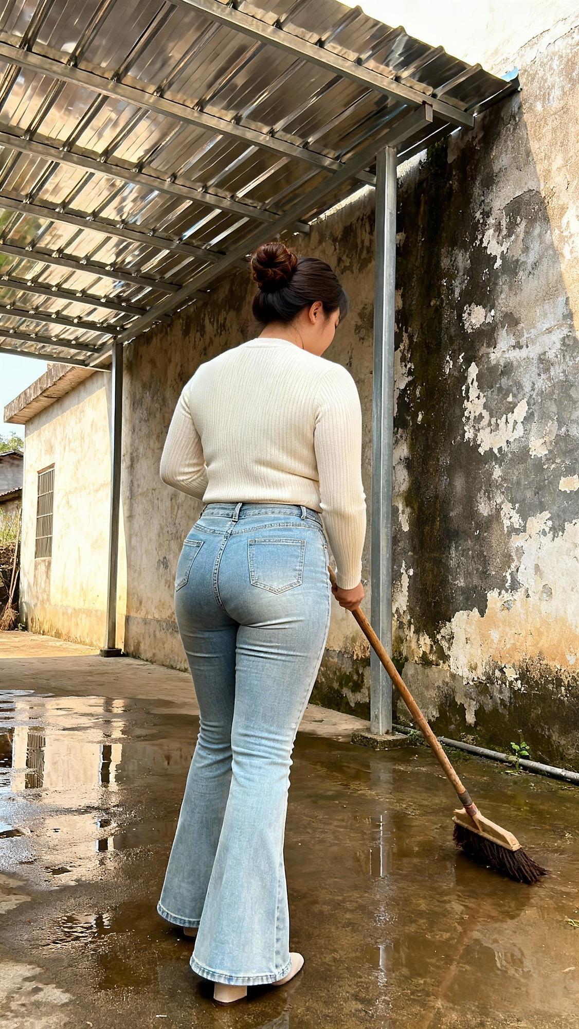 斑驳的墙垣旁,金属雨棚的光影落在湿润的地面上,泛着浅浅的水泽。浅米色针织衫的轮廓裹着烟火气,水洗蓝的牛仔喇叭裤贴着步履,木柄扫帚轻触地面,在水迹里划出温柔的弧度。老旧的墙面剥蚀着时光,而扫帚扫过的每一寸,都像是在拂去岁月的尘屑,把寻常日子的琐碎,揉进这一方带着潮湿气息的角落,平凡的动作里,是生活最朴素的温柔与妥帖。农村