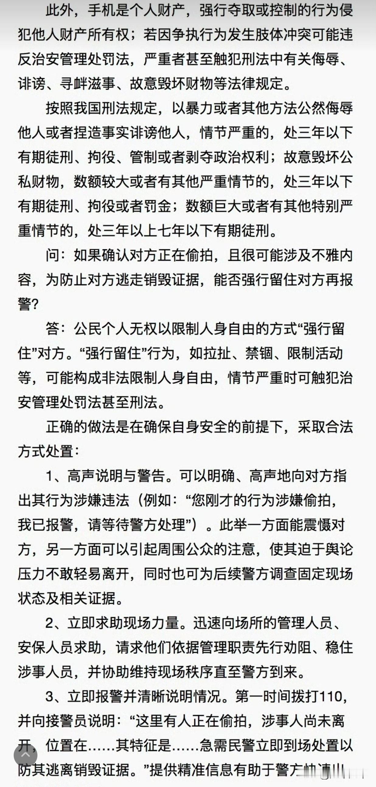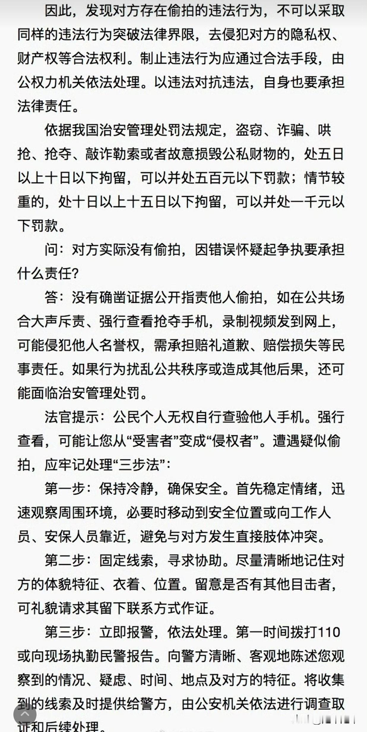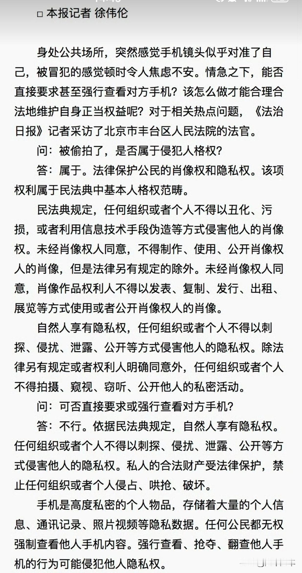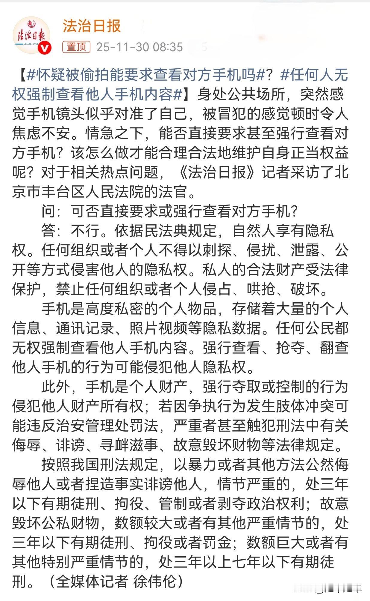 怀疑被偷拍时,能否要求查看对方手机?答案是否定的,强行查看他人手机涉嫌违法。 法制日报11月30报道了记者采访法官时,法官的解释。 手机是高度私密的个人物品,存储大量隐私信息。依据《民法典》第1032条和第267条,强制查看、抢夺或翻查他人手机可能侵犯隐私权和财产权。即使对方“自愿”也存风险若对方主动展示手机,随意翻查相册或数据仍可能越权侵犯隐私。唯一合法方式是报警后由警方依法检查。 并且错误怀疑他人还需承担法律责任。无确凿证据时公开指责他人偷拍,构成名誉侵权,需赔礼道歉、赔偿损失。若扰乱公共秩序,还将面临治安处罚。 维权需以合法性为前提,保持冷静→固定线索→报警处理→依法追责。公民个人无执法权,但公权力机关可依法介入调查。偷拍盗摄