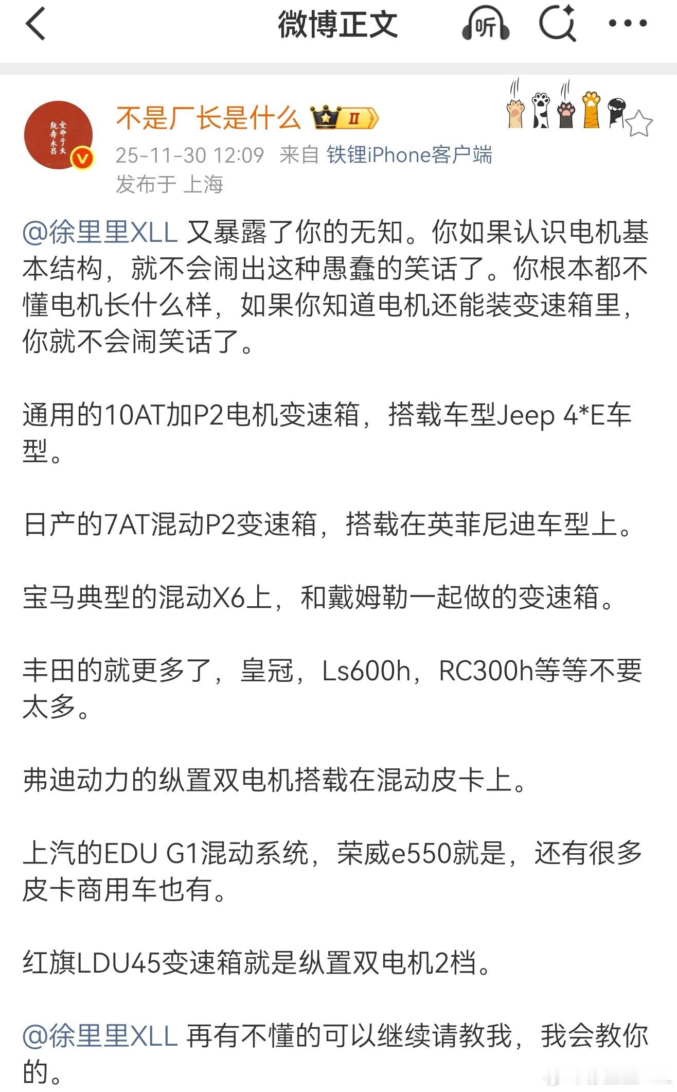 我事先声明...厂长真的不是我的捧哏。真的不是我花钱请来的演员...Jeep为啥会用通用的变速箱?Jeep 有个插混系列,是叫4xe,而不是4*E。Jeep没有4*E产品。比如牧马人4xe,用的正是采埃孚的混动8AT,跟通用有啥关系啊?Jeep全系就没有10AT的车型。英菲尼迪那个3.5混动,你都知道是P2了,会不知道那并不是跟变速器集成在一起的?宝马混动X6?你是说的E72?那个将近20年的老古董?你再大声说一遍那是电机跟变速箱集成在一起的?看到这还有往下看的必要吗?该用自信形容你还是该用辣眼睛形容你?主打能忽悠一个是一个对吧?这样也能吸到粉啊?我怀疑厂长这又是问搜索引擎和豆包问来的。