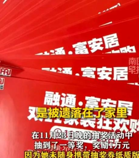 女子购买13万家具共得50张抽奖券,一张抽中万元大奖, 女子说她带着身份证和奖券照片前去兑奖, 服务人员却因没有纸质奖券而拒绝兑奖, 他说因为把奖券忘在了家里,厂家竟然以未在一分钟内手持抽奖券, 而拒绝兑奖。 这是厂家玩不起, 还是女子太粗心。 厂家应该说清楚兑奖规则, 人家没拿奖券, 可以去回家取来继续兑奖, 而不是因为人家在一分钟内未拿出奖券而取消兑奖。