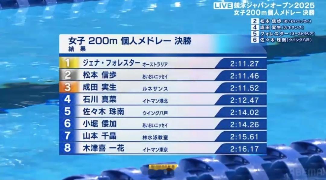 日本游泳公开赛 女200混决赛Jenna Forrester 2:11.27松本信步 2:11.46成田实生 2:11.52