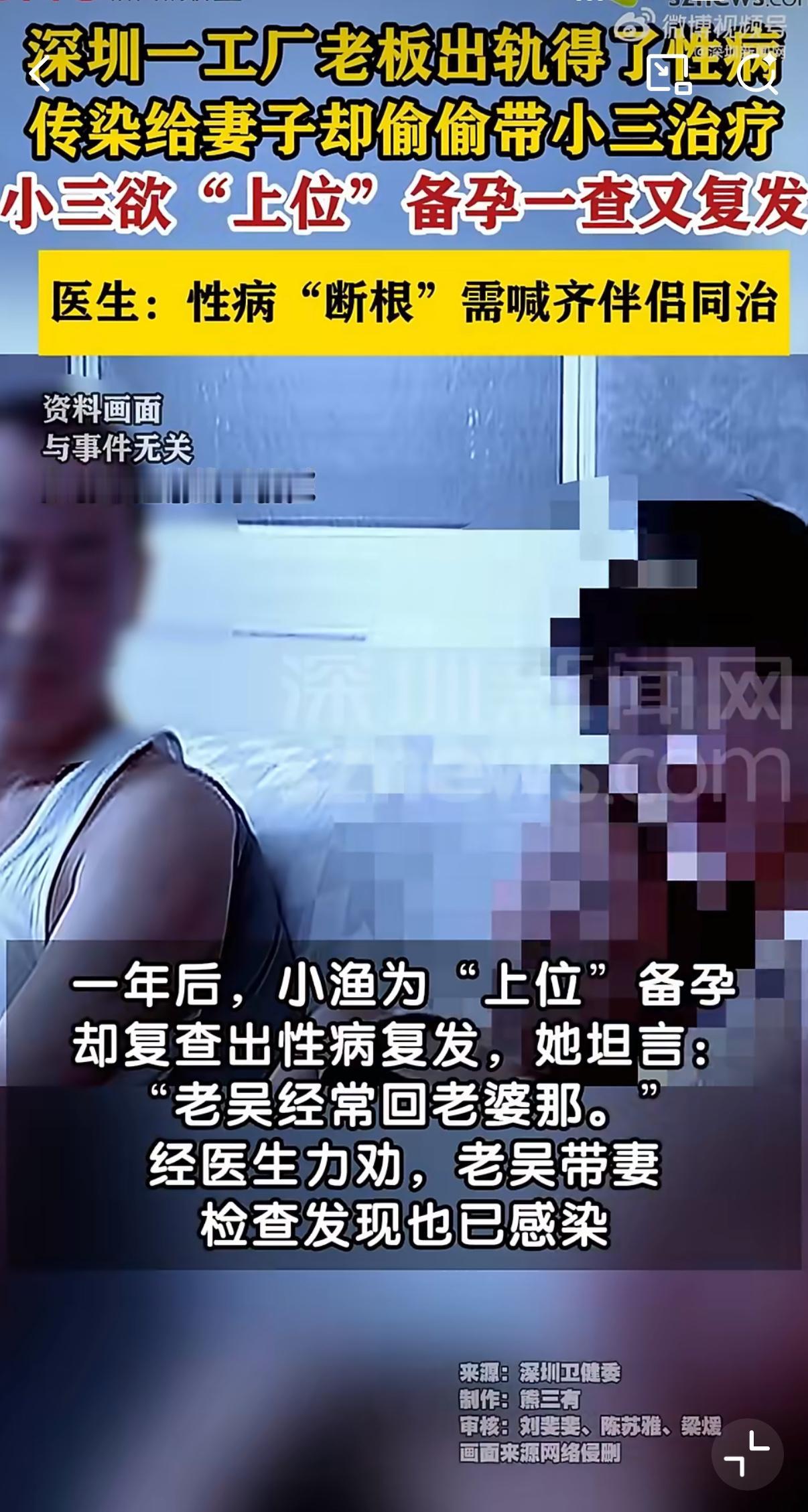见过自私的男人,没见过这么把老婆当外人、把小三当宝贝的!深圳一位开工厂的老吴都五十多了,家里有老婆管着工厂、操持家务,外头还养着个三十多岁的情人小渔,不仅给她钱开美容院,连染了性病都只带着小三偷偷治疗,把老婆蒙在鼓里,最后让无辜的妻子硬生生躺枪。 老吴一年前体检查出了生殖道沙眼衣原体感染,这病能通过亲密接触传播,可他第一时间拉着情人小渔去医院,两人一起治疗转阴,却对老婆提都没提。他还跟小渔发誓,说自己早就不碰老婆了,不用让她检查。直到小渔想备孕“上位”,复查时发现病又复发了,医生追问之下才捅破了这层窗户纸——老吴根本没断了和老婆的来往,所谓的“不碰”只是骗情人的谎话。没办法,老吴才连哄带骗让老婆去检查,结果不出所料,老婆也被感染了,可她因为这病症状不明显,一直蒙在鼓里,直到确诊都不敢相信。更讽刺的是,老吴压根不想离婚,因为工厂全靠老婆打理,离婚就等于砸了自己的饭碗,他一边想保住家庭的经济来源,一边又舍不得外头的情人,把两头都算得明明白白,唯独没考虑过老婆的健康和感受。 婚姻里最基本的就是忠诚和责任,老吴不仅背叛了婚姻,更把老婆的生命健康当儿戏。他不是不知道这病会传染,不然也不会第一时间带小三治疗,可他偏偏对老婆隐瞒,本质上就是觉得老婆的健康不值钱,比不上他两头讨好的安稳日子。这种男人心里根本没有爱,只有算计——老婆是帮他守家业的工具,情人是满足他私欲的消遣,他把自己的快乐建立在两个女人的痛苦上,自私到了骨子里。 更让人寒心的是老吴老婆的反应,确诊后没有哭闹,只是平静地说要回去处理工厂出货、接孩子,她的隐忍背后,藏着多少无奈和心酸?很多时候,原配之所以选择忍,不是懦弱,而是被孩子、家庭、经济捆绑住了手脚。可婚姻不该是这样的,忠诚从来不是说说而已,健康权更不容侵犯。老吴的行为不仅违背了道德,还涉嫌违法,故意隐瞒性病传染给他人,本身就是对他人权益的侵害,原配完全可以拿起法律武器保护自己。 婚姻里的信任一旦崩塌,伤害可能不止是感情,还会危及健康。不管是夫妻还是伴侣,坦诚相待才是底线,任何时候都不能拿别人的健康赌自己的私欲。你觉得老吴的老婆该选择原谅还是离婚?如果是你遇到这种事,会怎么处理?欢迎在评论区说说你的看法。 来源:深圳新闻网