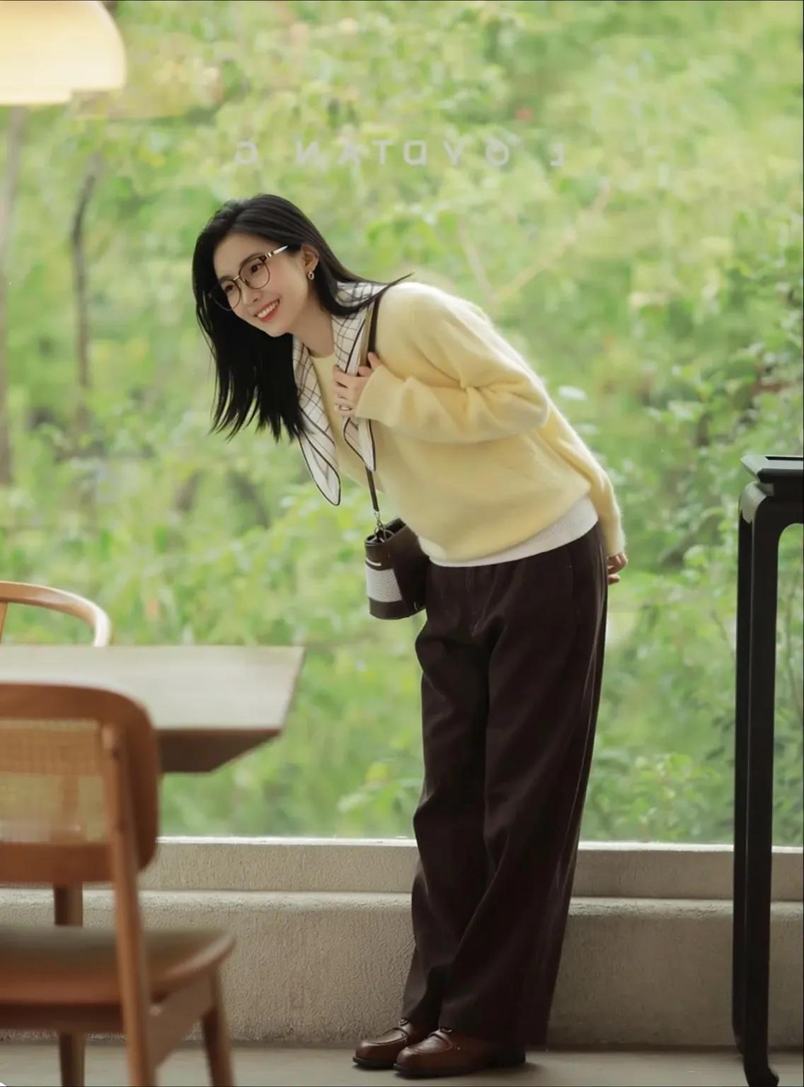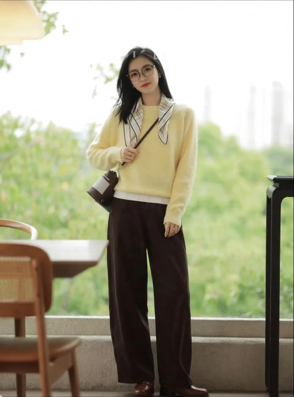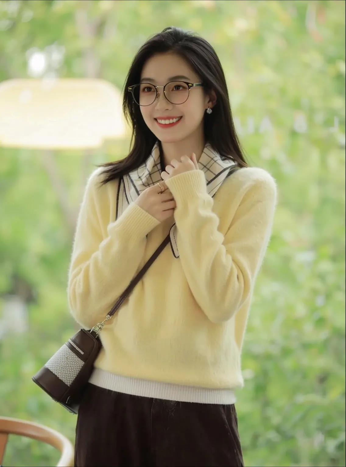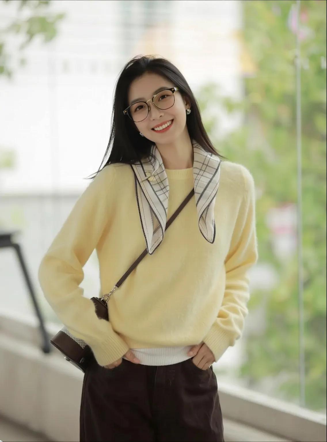 浅黄毛衣裹着温柔的秋,格纹围巾系住细碎的风,连阳光都跟着笑弯了眼。