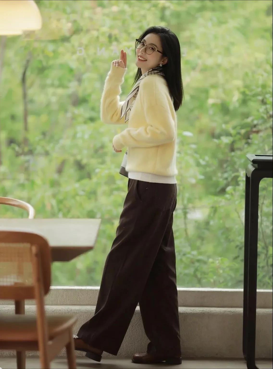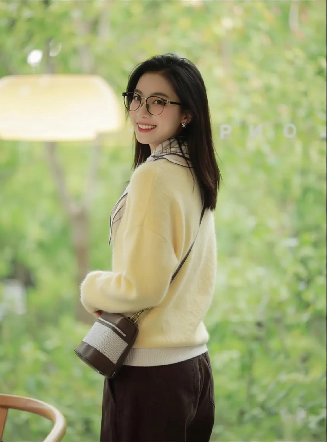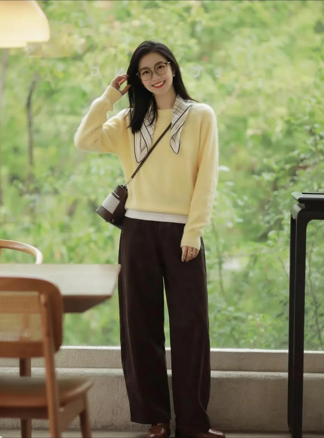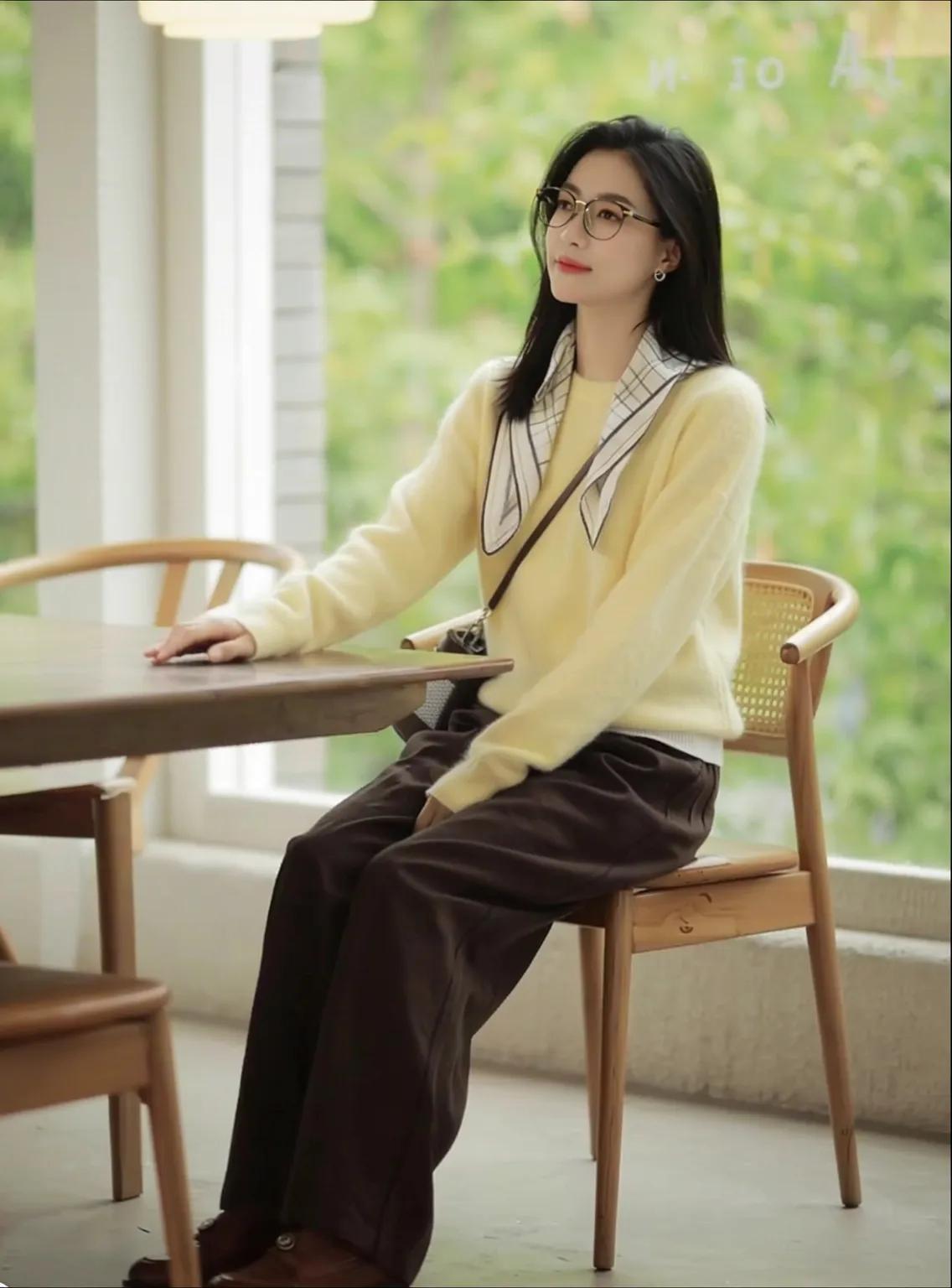 浅黄毛衣裹着温柔的秋,格纹围巾系住细碎的风,连阳光都跟着笑弯了眼。