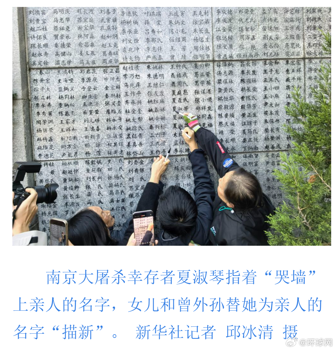 #在世南京大屠杀幸存者仅剩24人#【#南京举行大屠杀死难者家庭祭告活动# 在世幸存者仅剩24人】第十二个国家公祭日到来前,南京大屠杀死难者家庭祭告活动于11月30日启动。据统计,今年又有8位南京大屠杀幸存者去世,在世幸存者仅剩24人。 一大早,幸存者夏淑琴、刘民生带着家人,赶到侵华日军南京大屠杀遇难同胞纪念馆的“哭墙”前,鞠躬、献花、默哀,祭奠在88年前遇难的亲人和同胞。 “88年了,88年了,88年了……”站在“哭墙”前,夏淑琴喃喃道。她的外孙女夏媛说:“外婆是在告诉家中亲人,又来看他们了。” 1937年12月13日,夏淑琴家中9口人有7人惨遭日军杀害,时年8岁的她在身中3刀后,因昏死过去幸免于难。夏淑琴很快找到“哭墙”上亲人的名字,她用手指着名字,女儿和曾外孙则用黑笔替她为亲人的名字“描新”。 91岁的刘民生站在“哭墙”前陷入回忆:“我还记得那天在难民区,父亲被日本兵抓走了,再也没有回来。我的右腿被日本兵刺了一刀,至今还留有伤疤。”老人希望,子孙后代能永远记住这段历史,让悲剧不再重演。 时间的证人随着岁月的流逝在凋零。截至目前,由南京市侵华日军受害者援助与南京大屠杀历史记忆传承协会登记在册的在世幸存者仅剩24人。 历史,需要一代一代接力传承,即便这种传承是一个痛苦的过程。“每次站在侵华日军南京大屠杀遇难同胞纪念馆前,耳边总会响起一声撕心裂肺的呼喊,‘妈妈,你醒醒’——那是9岁的父亲,在1937年的寒冬里,对着倒在血泊中的祖母,一遍又一遍哭喊……”“哭墙”前,已故南京大屠杀幸存者常志强的女儿常小梅,向大家讲述父亲那段惨痛的经历。 像常小梅、夏媛这样的幸存者后代,以及救助中国民众、留存历史铁证的中外人士后人接过了传承南京大屠杀历史记忆的接力棒。截至目前,共有38名中外籍人士成为南京大屠杀历史记忆传承人,他们通过各自的方式传承历史、传播真相、传递信念。 “我想对着祖母沉睡的地方,轻声说一句:奶奶,您放心,您的儿子没有忘记您,您的孙女会把您的故事讲下去。”常小梅说,愿所有遇难同胞安息,愿这世间再也没有“妈妈,你醒醒”的绝望,愿和平之花永远绽放在这片土地上。(新华社)