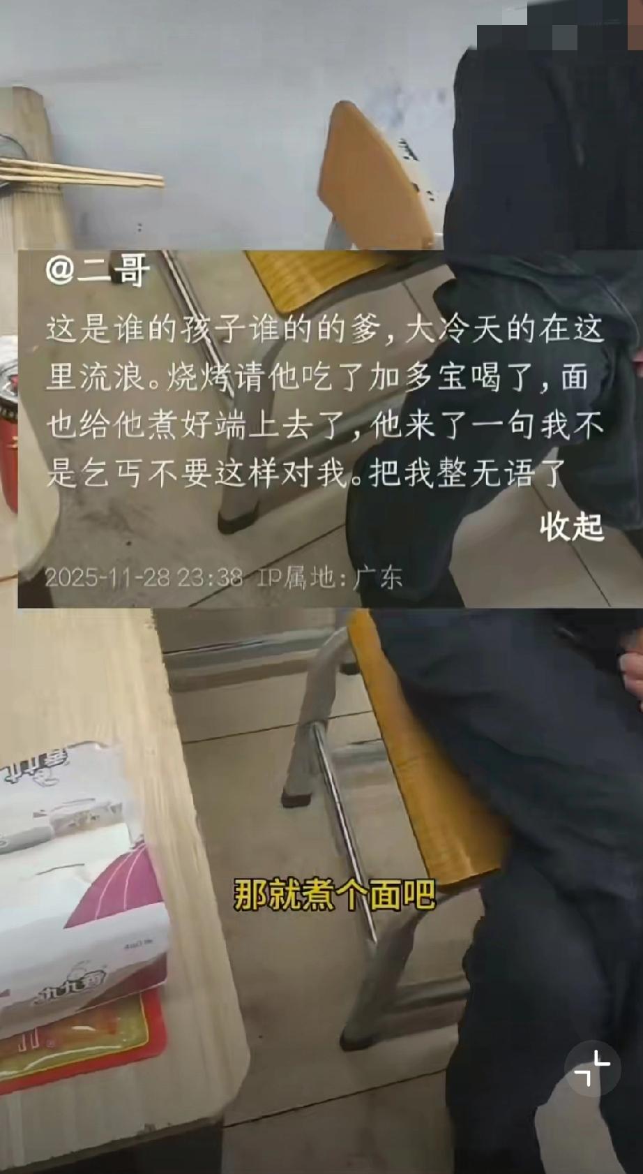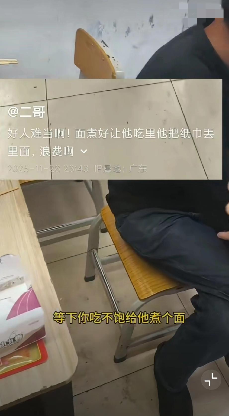 11月28日,网友吐槽,店主好心给煮面却被扔纸巾。 店主见男子无钱付账,决定烧烤和加多宝免费,又担心他没吃饱问要不要煮面,男子说那就煮个面吧,万万没想到面煮好了男子向面中扔纸巾,说他不是乞丐别这样对他,直接给店主整无语了。(来源:二哥)给自己一句话,你会说什么? 什么时候让你觉得人间值得?荒唐事例分享