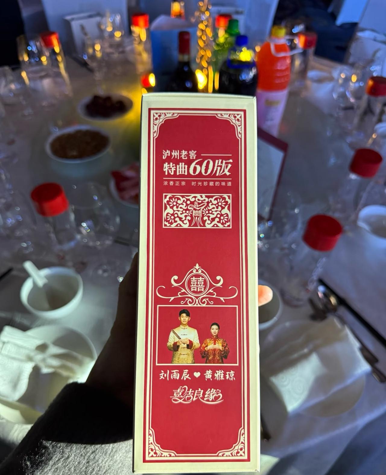 刘雨辰黄雅琼婚礼。 酒:定制版的泸州老窖红60,上面印了他俩的照片; 李克勤、马龙、樊振东、王楚钦、陈梦、吴易昺、潘展乐等人送上视频祝福。