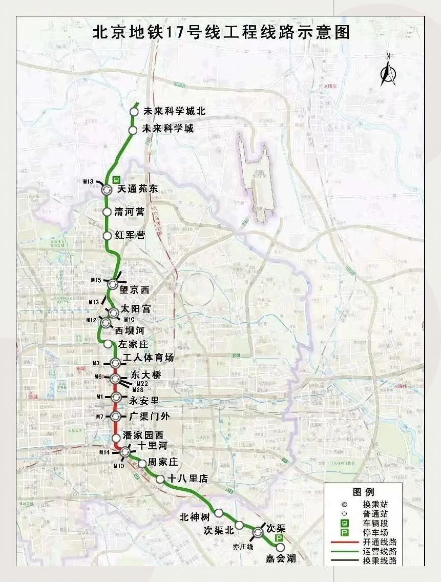 北京地铁17号线 北京地铁17号线可太值得说道说道了!北京地铁17号线是一条贯穿东部城区南北方向的轨道交通干线,南起嘉会湖站,北至未来科学城北站,全长49.97公里,共设21座车站。目前,17号线已启动贯通按图试运行,但载客段仍为既有南段(嘉会湖站至十里河站)和北段(工人体育场站至未来科学城北站),中段(十里河站至工人体育场站)暂未载客运营。 17号线中段(十里河站至东大桥站)已实现长轨贯通,包含潘家园西站、广渠门外站、永安里站、东大桥站,预计年底开通试运营。中段开通后,全线贯通运营时间将缩短至66分钟。北京地铁 17号线东延伸 北京地铁图