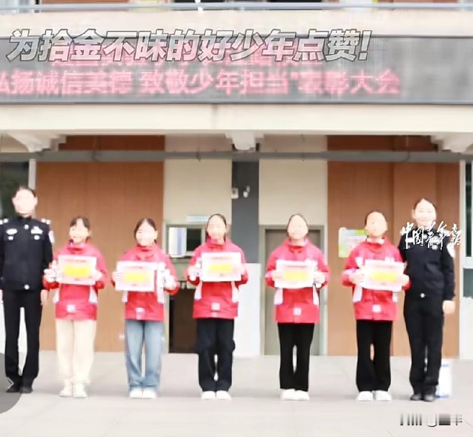 宜宾5名小学生火了!路边捡到1500元现金,做法太赞被全校表扬。 近日,宜宾叙州区的5个小姑娘用实际行动,让“拾金不昧”这四个字在新时代绽放出暖心光芒,网友纷纷点赞:“这才是少年该有的模样!” 11月22日,叙州某小学的刘依诺、刘依婷、李嘉桐、王相霖、郎语墨5名同学在路边玩耍时,意外发现一个遗失的钱包。打开一看,里面不仅有身份证、多张银行卡,还有1500余元现金。没有丝毫犹豫,孩子们第一时间想到失主可能会着急,在原地耐心等待许久仍未见人后,她们结伴一路狂奔,把钱包完整交到了派出所民警手中。 民警通过身份证信息很快联系上失主,为了表彰孩子们的善举,失主和民警特意来到学校,在庄严的升旗仪式上为5名同学颁发了“拾金不昧好少年”奖状,还送上了精心准备的小礼品。面对全校师生的掌声,孩子们腼腆又骄傲的笑容,成了校园里最动人的风景。 在物质条件越来越好的今天,这些小学生没有被金钱诱惑,反而坚守着诚实善良的底线。她们或许不懂“君子爱财取之有道”的深刻道理,却用最纯粹的行动诠释了责任与担当。拾金不昧从来不是过时的美德,而是跨越年龄的精神标杆——这5名宜宾少年,用小小的身影扛起了大大的正能量,给我们所有人上了生动的一课。 为新时代好少年点赞!愿这份善良与真诚能传递下去,让更多人感受到温暖,让美德之花在校园、在社会处处绽放~