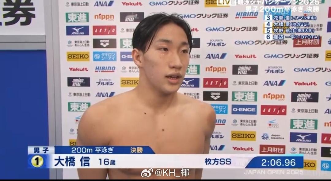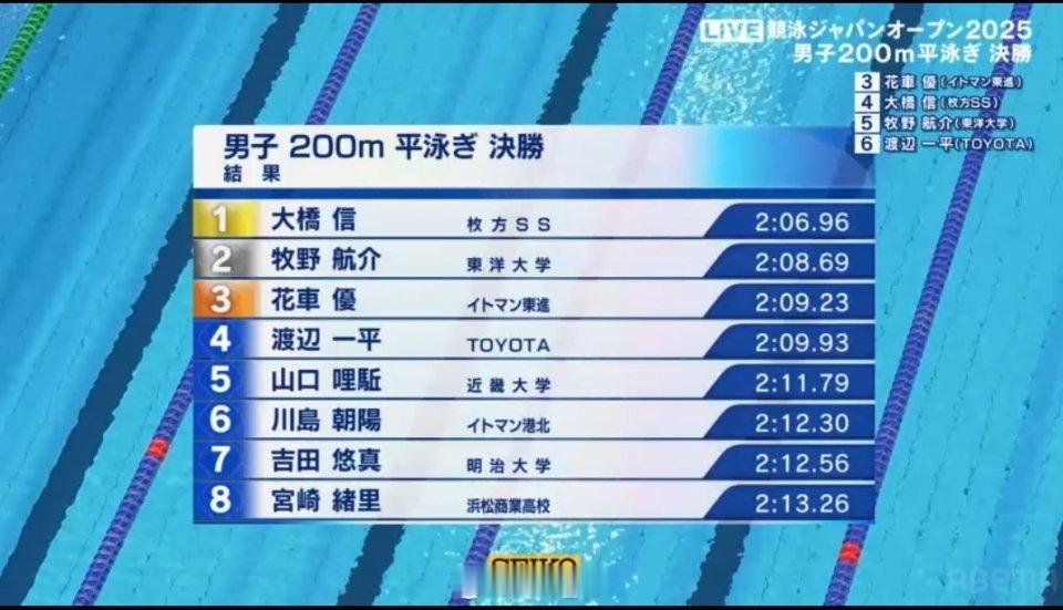日本游泳公开赛 男200蛙决赛大桥信 2:06.96 牧野航介 2:08.69 PB花车优 2:09.23渡边一平 2:09.9316岁小将再一次2:06+,差一点打破自己的世青纪录!