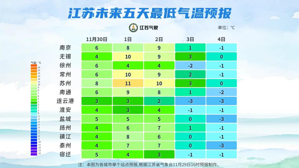 江苏盐城:最低-4℃,冰冻!盐城接下来… 这个周末阳光明媚 晴空万里今天最高气温也在20℃左右体感舒适不管洗晒还是出游都很适合 据@盐城气象 最新消息12月初全市将迎来大降温目前有一股寒潮正影响着北方地区 中央气象台11月30日06时继续发布寒潮蓝色预警 受寒潮影响,预计11月30日白天至12月3日,我国中东部地区将自北向南出现大风降温,江南东部及以北地区日平均或最低气温普遍下降6~10℃,内蒙古、华北北部、东北地区、黄淮等地下降10~14℃,局地降温可达18℃左右。12月4日早晨,最低温度0℃线将南压至浙江中部、安徽南部、湖北北部一带。 其中11月30日白天至12月2日,内蒙古、华北北部、东北地区、黄淮等地气温下降6~10℃,内蒙古中东部、黑龙江西部、吉林东部、辽宁东北部等地的部分地区降温可达10~14℃。 本周2日我市云系较多,局部有弱降水,其余时段以晴或多云天气为主。2日夜间到3日受较强冷空气影响,48小时(2-4日)最低气温降幅可达8~9℃,4日早晨最低气温-4~-3℃,部分地区将出现冰冻。冷空气影响期间,2日夜间至3日全市风力较大,将出现陆上6级,海区8级左右的偏北大风。 全市今天夜里到明天白天多云偏北风4到5级阵风6级转偏东风4级左右明天最低气温5到6℃明天最高气温13到14℃ 大降温要来了 今天气温继续回升全省大部分城市最高温度将达到20℃上下接下来一场持续数天的大降温即将拉开序幕12月1日后期全省有1次较强冷空气过程影响后全省最低气温48小时降幅达6—11℃4日早晨气温较低沿江和苏南地区-1℃— -3℃5日至7日全省气温有所回升 具体天气预报 12月2日多云到阴局部有时有小雨西北风4到5级阵风6级气温5℃到13℃ 12月3日多云到晴西北风4到5级阵风6级转偏西风4级左右气温-1℃到6℃ 12月4日多云到晴偏西风转偏北风4级左右气温-4℃到8℃ 12月5日晴到多云偏南风4级左右气温-1℃到11℃ 12月6日晴到多云西南风4到5级气温1℃到15℃ 12月7日多云偏北风4到5级阵风6级气温3℃到13℃ 寒潮来临大伙要关注天气变化及时添衣保暖哦 来源 | 中国天气、江苏气象、盐城气象。