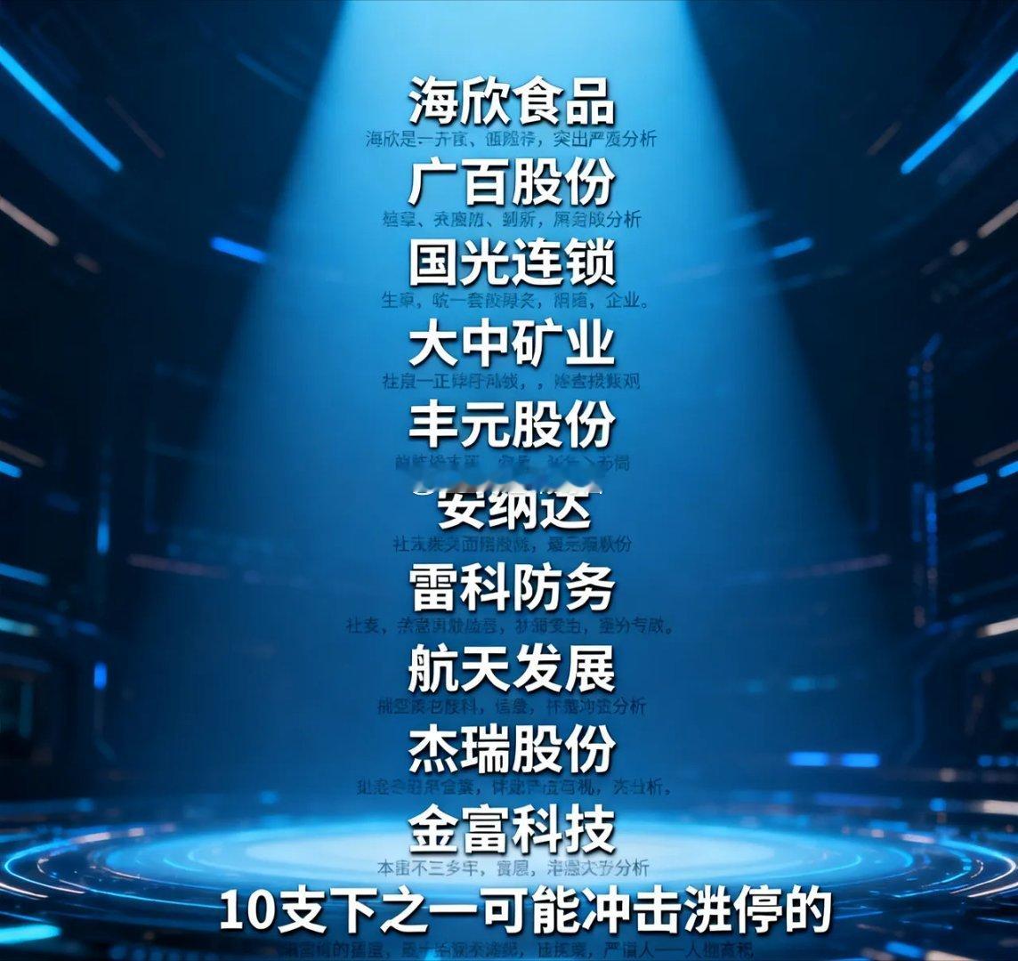 周一潜在涨停先锋:10支潜力股深度解析(附核心逻辑)在政策导向与行业景气度共振的市场环境下,部分个股凭借题材催化、业绩支撑或龙头地位,有望在周一迎来强势表现。以下是10支具备涨停潜力的标的深度分析,供投资者参考:一、大消费板块(政策红利驱动)1. 海欣食品(002702):百年龙头企业叠加国家农业产业化重点资质,以速冻鱼糜制品为核心的业务矩阵覆盖全国,深度绑定大型商超与农贸分销网络。作为大消费板块3连板领涨标的,在政策利好持续释放背景下,龙头效应与资金惯性形成共振,后续上涨动能充足。2. 广百股份(002187):广州区域商业零售标杆,凭借百货零售与超市连锁双轨布局,占据广东市场核心份额,沉淀了成熟的运营体系与优质商业资源。六部门促消费实施方案落地催生行业机遇,公司财务稳健的抗风险优势凸显,补涨空间值得期待。3. 国光连锁(605188):江西区域零售龙头,聚焦超市与百货核心业务,通过精细化供应链管理与门店运营优化,深度贴合本地消费需求。随着促消费政策逐步落地,零售行业旺季临近,区域消费市场复苏将直接带动公司业绩改善,有望吸引资金重点关注。二、新能源与周期板块(景气度回升+业绩支撑)4. 大中矿业(001203):锂电池产业链核心资源型企业,拥有完整产业链布局,铁精粉与球团矿产品市场竞争力突出,同时积极拓展锂电池材料业务。2025年三季报交出亮眼成绩单,每股收益0.39元、毛利率46.86%的业绩表现筑牢估值基础,叠加锂电池板块热度回升与涨价题材催化,资源优势有望转化为股价上涨动力。5. 丰元股份(002805):锂电池正极材料领域技术型企业,核心产品涵盖草酸亚铁锂、磷酸铁锂等,精准契合新能源汽车行业爆发式增长带来的需求缺口。尽管2025年三季报每股收益为-1.34元,但随着产能释放与市场份额扩张,业绩拐点渐行渐近,行业高景气度将持续为股价提供支撑。6. 安纳达(002136):国内钛白粉行业骨干企业,产品广泛应用于涂料、塑料、造纸等多领域,凭借成熟生产工艺与稳定产品质量占据市场优势。当前钛白粉市场需求逐步回暖,公司产业链延伸战略成效初显,叠加内部管理优化,有望扭转2025年三季报-5.1651%净利率的局面,股价反弹可期。三、军工与航天板块(事件催化+长期逻辑)7. 雷科防务(002413):军工电子领域硬核企业,聚焦雷达系统、卫星导航、智能控制等核心产品,凭借强研发实力与长期合作的军工企业、科研院所资源,深度绑定行业发展。第三届商业航天发展大会12月召开的事件催化下,商业航天概念持续升温,作为板块热门标的,资金关注度居高不下,上涨态势有望延续。8. 航天发展(000547):中国航天科工集团旗下核心上市平台,专注电子信息、通信对抗等军工核心业务,依托集团强大资源与技术优势,在国防信息化建设中占据关键地位。尽管2025年三季报净利润为-5.4769亿元,但军工行业长期增长逻辑明确,公司业务发展前景广阔,估值修复空间较大。四、高端制造与细分龙头(订单催化+人气带动)9. 杰瑞股份(002353):国内油气田装备与服务领域领军企业,产品质量与性能获全球客户认可,核心业务涵盖油气田设备制造与钻井服务。近期斩获超1亿美元数据中心发电机组合同,巨额封单彰显市场对其业绩增长的强烈信心,叠加全球油气价格上涨与开发投资增加,行业景气度上行将推动公司业务持续向好。10. 金富科技(003018):塑料防盗瓶盖细分领域龙头,客户覆盖食品、饮料行业知名企业,凭借技术优势与稳定产品质量占据核心市场份额。作为市场连板高度标的,其持续突破能力有望激活相关题材人气,而稳健的财务状况为股价上涨提供安全垫,后续仍具备继续冲高的动力。以上信息仅供参考,不构成投资建议。投资有风险,入市需谨慎。