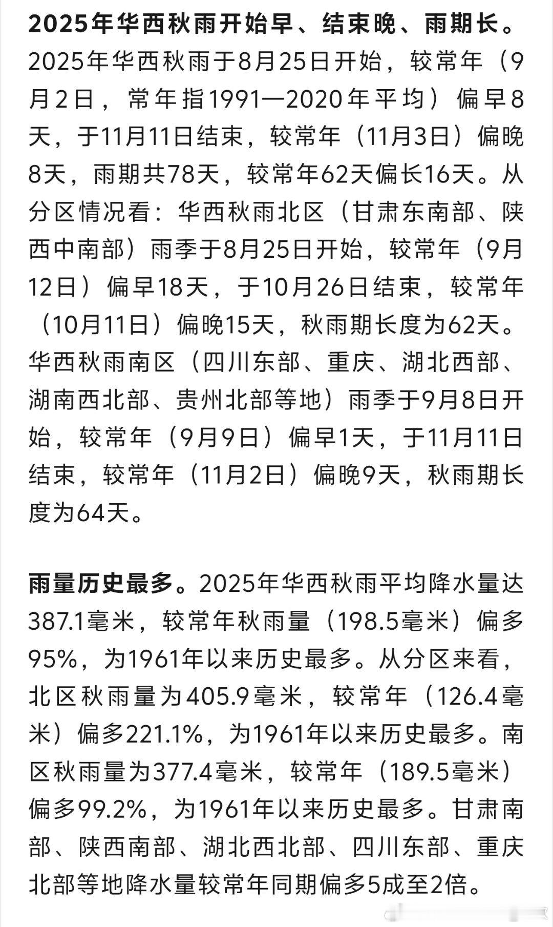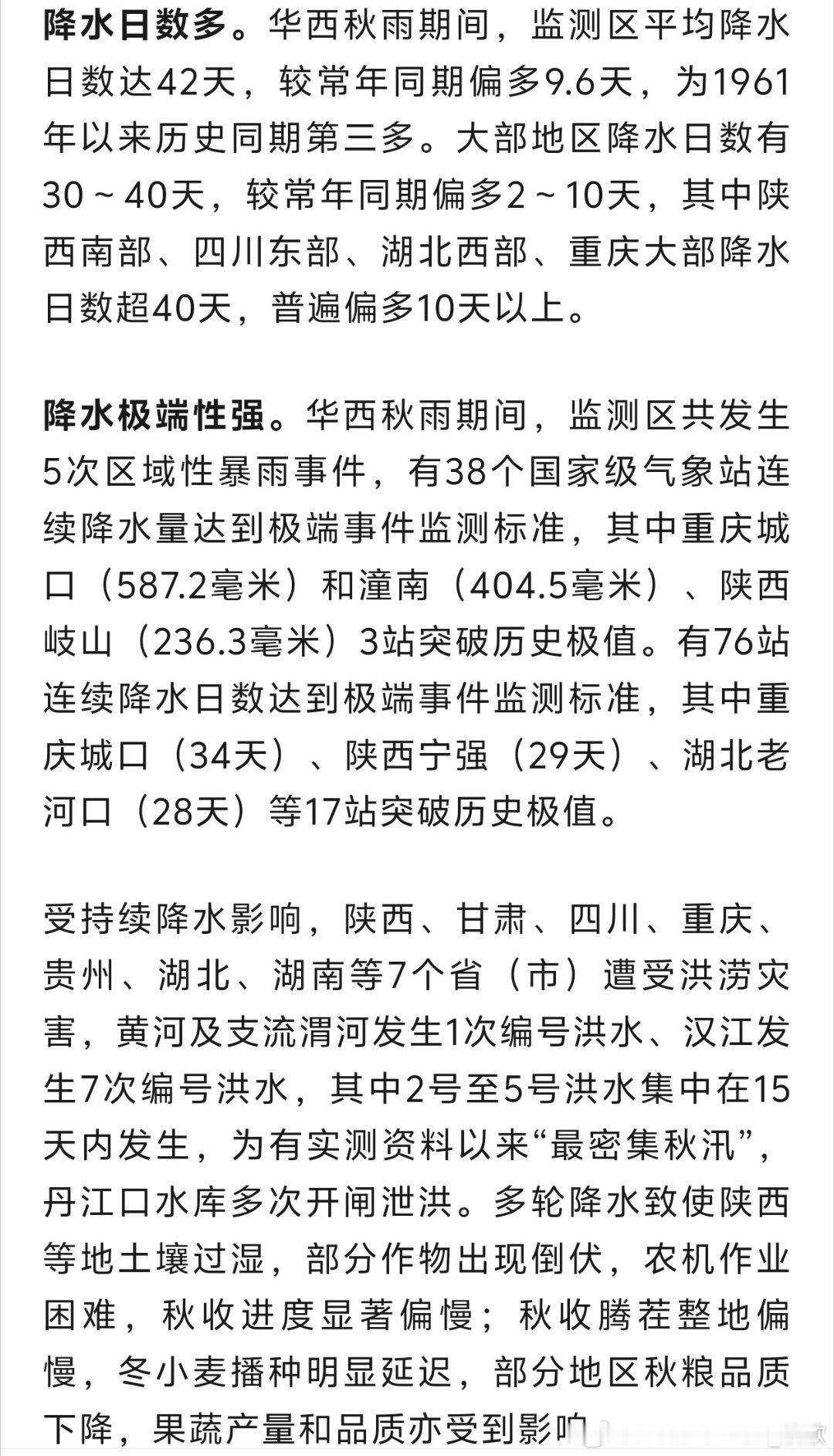 【华西秋雨时间长 雨量破纪录】今天国家气候中心给出报告,今年华西秋雨从8月25日开始,11月11日结束。开始提前8天,结束推后8天,比常年62天偏长16天。今年华西秋雨平均降水量387.1毫米,较常年秋雨量198.5毫米偏多95%,为1961年以来最多。而且降雨极端性强,黄河及支流渭河发生1次编号洪水、汉江发生7次编号洪水,其中2号至5号洪水集中在15天内发生,为有实测资料以来“最密集秋汛”。