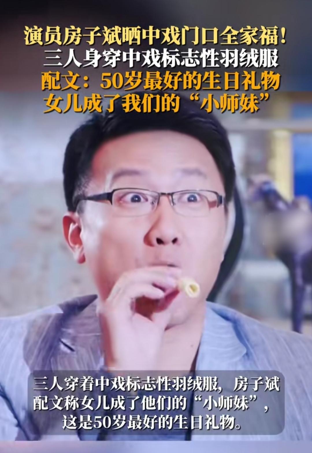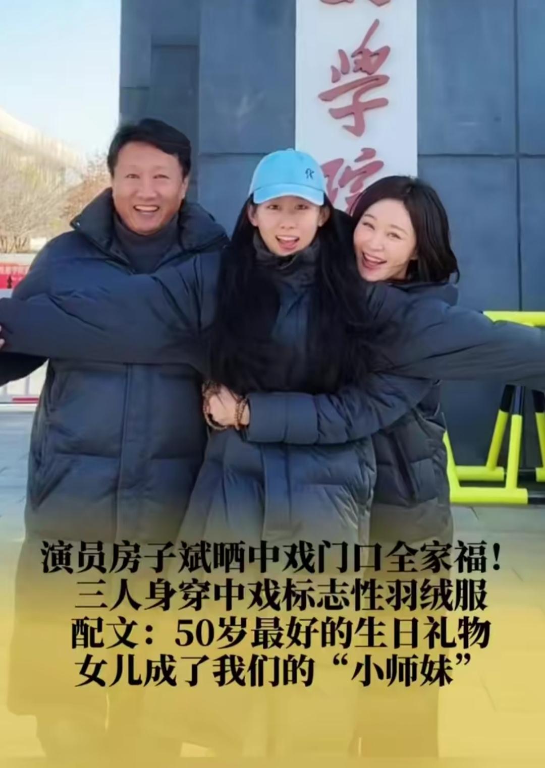 中戏门口一件同款羽绒服,让无数网友破防了!演员房子斌晒出一家三口合照,三人穿着中戏标志性羽绒服,配文说女儿成了自家“小师妹”。 这可是实打实的“一门三校友”啊!11月27日,房子斌分享这份喜悦,直言这是自己50岁最好的生日礼物。照片里没有华丽穿搭,就一件朴素的校园羽绒服,却装下了两代人的青春和梦想。 这哪是简单的全家福,分明是艺术世家的温柔传承。不是强迫,不是期望,而是孩子自然而然追随父母的脚步,把热爱变成了家族的延续。这种不刻意的传承,比任何荣誉都珍贵。 现在太多父母逼着孩子走自己选的路,可最好的教育,从来都是潜移默化的影响。你身边有这样代代相传的小美好吗?