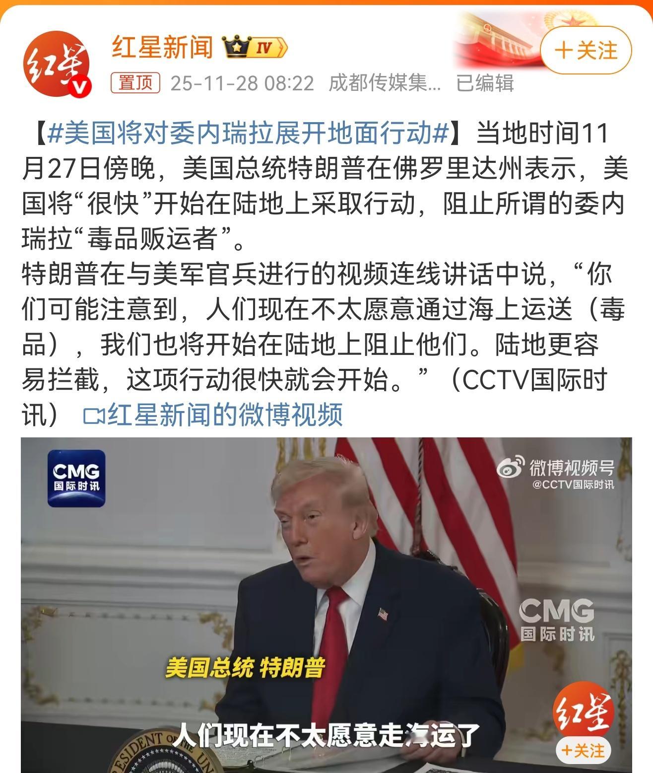 缉毒幌子下的霸权图谋,难掩地区动荡风险美国以“打击毒品贩运”为由宣布对委内瑞拉开展地面行动,看似师出有名,实则是“特朗普式门罗主义”的赤裸展演。所谓“缉毒”不过是精心包装的借口——美国缉毒局报告显示其缴获可卡因主要来自哥伦比亚,而非委内瑞拉,美方却动辄出动航母打击群,用不对称军力制造危机,本质是借军事威慑谋求政权更迭、掌控拉美资源与通道。美方一边以贸易协议拉拢拉美右翼国家,一边用军事威胁施压委内瑞拉,“胡萝卜加大棒”的伎俩背后,仍是“美洲是美国人的美洲”的霸权逻辑。这种单边制裁与军事胁迫的组合拳,早已让委内瑞拉陷入经济困境,而欧洲多国限制情报共享、美洲国家组织呼吁和平对话的表态,也凸显国际社会对美方单边行动合法性的质疑。历史已经证明,军事干预从来不是解决问题的良方。美国若执意将拉美变为地缘博弈的战场,不仅可能重蹈阿富汗陷阱的覆辙,更会加剧西半球的动荡与分裂。唯有摒弃霸权思维,通过平等对话尊重各国主权,才能真正维护地区安全与稳定。美国将对委内瑞拉展开地面行动
