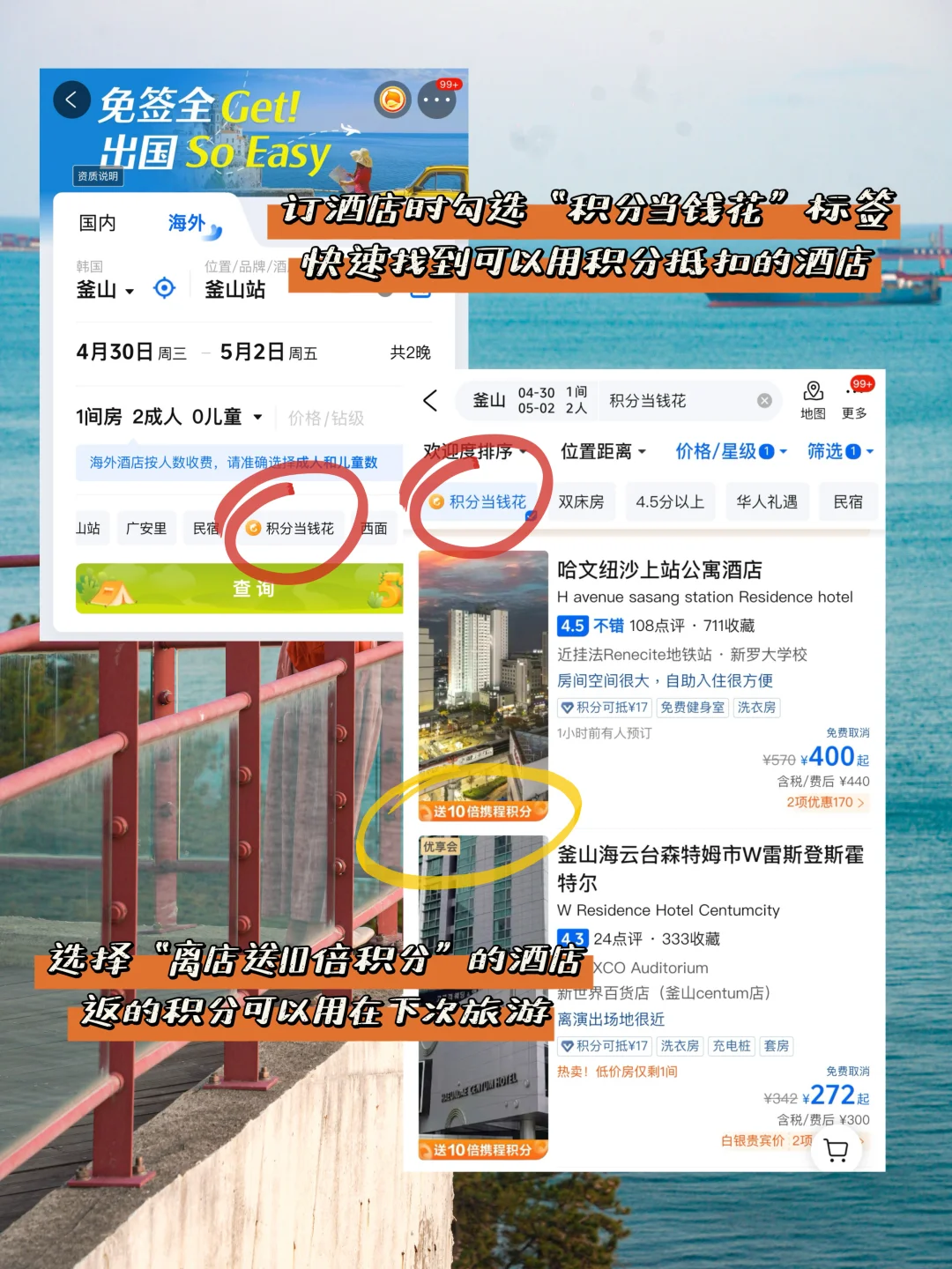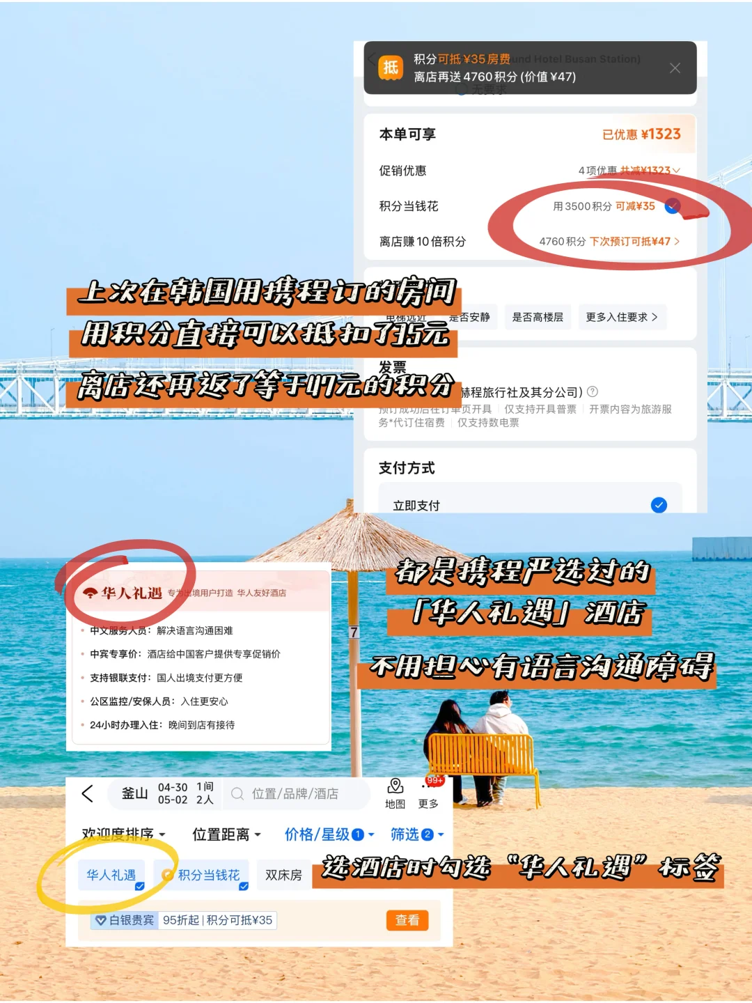 一直觉得韩国挺有“旅缩力”的 但前阵子去了趟韩国 没想到还有釜山这么漂亮又好玩的地方 ✔️彩色胶囊小火车✔️海上列车✔️落日咖啡 ✔️小王子村庄✔️童话升降机✔️海上透明缆车… 既不同于首尔,自带海滨城市特有的惬意 也不同于济州岛,满是活泼热烈的氛围 📷分享几个我很喜欢的拍照机位,五一假期去釜山一一打卡吧! - 1️⃣釜山小镰仓 📍胶囊小火车清沙浦站旁的十字路口,列车从中间驶过,很有镰仓内味 2️⃣人与胶囊火车同框 📍Ocean Breeze,机位在店旁边小路平台 3️⃣胶囊火车与灯塔 📍机位2再上坡走一点点的一个废弃露天停车场 4️⃣胶囊火车穿梭小镇 📍Simmian,机位就在这家店前面 5️⃣192童话阶梯升降机 📍부산 서구 동대신동2가 87-302 6️⃣宫崎骏海上列车 📍松亭-清沙浦-尾埔的海上列车,约40r/人 7️⃣小王子俯瞰甘川文化村 小王子经典机位人太多了,📍Gamnae Byeolmaru体育中心这里的小王子更好拍 8️⃣甘川文化村全景机位 📍公交站后的下坡路 9️⃣广安里海景窗框 📍Nasari Sigdang,窗口直面广安里海水浴场 1️⃣0️⃣绝美日落海景咖啡店 📍THRILL ON THE MUG,蓝调时刻打卡绝佳 1️⃣1️⃣很特别的礁石海边 📍清沙浦站外的海边 1️⃣2️⃣灯塔咖啡店 📍BRONI,二三楼面向灯塔大海,很惬意 1️⃣3️⃣绝美海岸散步道 📍白浅滩文化村 - 🏨住宿小tips ✔️如果只玩1-2天时间,建议住在釜山站附近,不管飞机还是ktx都方便;如果是玩3-4天时间,建议住广安里或海云台附近 ✔订酒店想少花钱,可以用携程会员「积分当钱花」,把积分直接抵扣酒店房费,100积分抵1r,我上次订的房间就直接抵扣了35r,因为是十倍积分酒店退房时也返了4770积分,相当于再减47r,折扣力度超大!订酒店时筛选勾「积分当钱花」,能快速找到能用积分抵扣的酒店了(P5有教程) ✔而且在携程订酒店可以选「华人礼遇」类酒店,中文服务不用担心有语言障碍沟通不了,有问题也可以找24小时携程当地客服,大大的安心! -