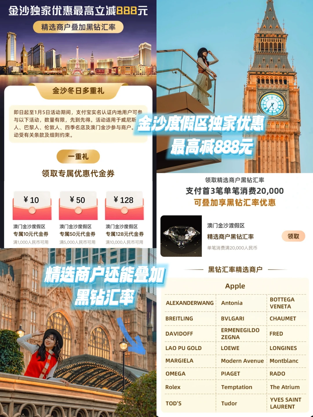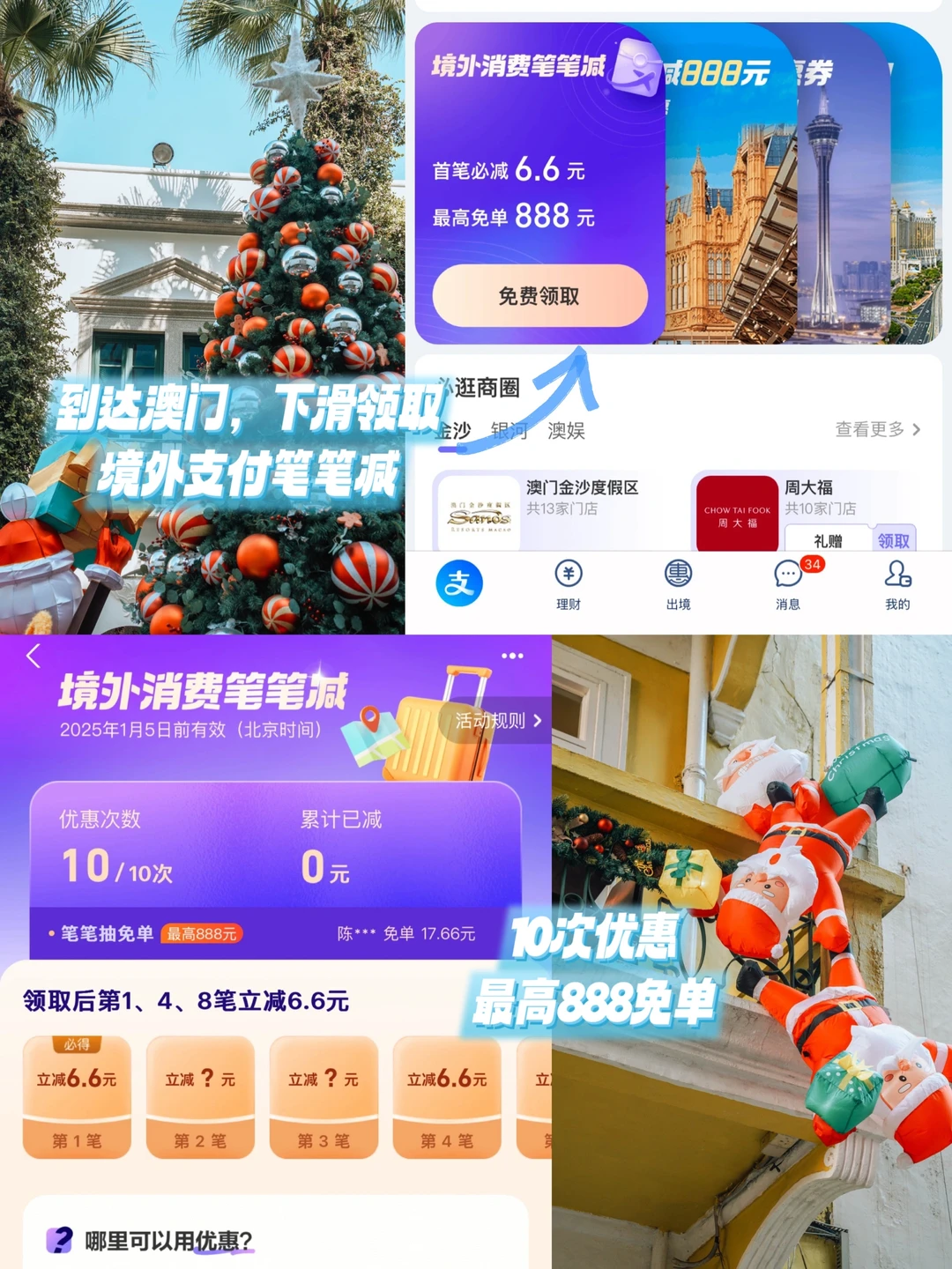 澳门,一个浪漫又有烟火气的城市 最近一部以澳门为背景电视剧《灿烂的风和海》 可以从不同角度看到澳门 给大家整理了一些剧里的同款景点 恰逢澳门回归25周年纪念,以及双旦到来 现在大街小巷都弥漫着💯的节日氛围, 还有很多消费福利🎁,来澳门打卡真的爽 - 🕙10:00东望洋灯塔 澳门的历史古迹之一,是剧里阿乐和小麦的秘密基地,关闸出来坐巴士到二龙喉公园,坐松山缆车登顶 🕚11:00大三巴牌坊 澳门著名地标,剧里主角也来这citywalk,恋爱巷和优衣库1楼2楼的框景都很出片!议事亭前地旁有个看「澳门」屋顶涂鸦的隐藏机位哦~饿了去旁边的花王堂街觅食😋,很多宝藏美食小店 🕜13:30衣湾斜巷 通向大海的道路,异国风情的粉色房子,还有墙边的三角梅,一切都是那么浪漫 🕑14:00主教山小堂 建在山顶的教堂,可以俯瞰澳门全景,澳门塔就在眼前,是剧里男女主角嘉慧和俊豪的“爱乐之城” 🕒15:00妈祖阁 澳门Macao命名的地方,也是澳门目前zui古老的庙宇 🕞15:30金沙度假区(威尼斯人、伦敦人、巴黎人)-l 这里有意大利同款威尼斯水城、英国同款大笨钟和双层巴士、法国同款巴黎铁塔,仿佛到了欧洲 🕔17:00官也街 各式各样的彩色房子以及「澳门」字样,还有各种美食,咖喱牛杂、鱼蛋、茶餐厅等 🕡18:30大潭山 坐上独特的斜式升降机,和剧里主角一样登山俯瞰氹仔,看华灯初上纸醉金迷的“金色海洋” 🕢19:30回到威尼斯人坐发财车到横琴口岸 - 📝澳门旅游小tips ✔带好身份证和有效签注的港澳通行证 ✔准备少量现金即可,现在澳门基本都可以支付宝支付了,大到奢侈品大牌,小到小吃餐厅~ ✔到达澳门后,记得先打开支付宝,首页下滑参与支付笔笔减活动,后面吃喝玩乐,只要用支付宝支付就可直接减10笔,运气好还有机会免单! 💎除此之外,一些商户还有专属的黑钻汇率,线下店铺扫一扫就能领,像DFA澳门免税店就是无门槛黑钻汇率。 ✔金沙度假区也有专属的优惠,笔笔减zui高能立减888元!TOD'S、Temptation等金沙商户还能再叠加专属黑钻汇率!优惠+汇率省上加省! 😝近期去澳门别错过这边羊毛啦~ -