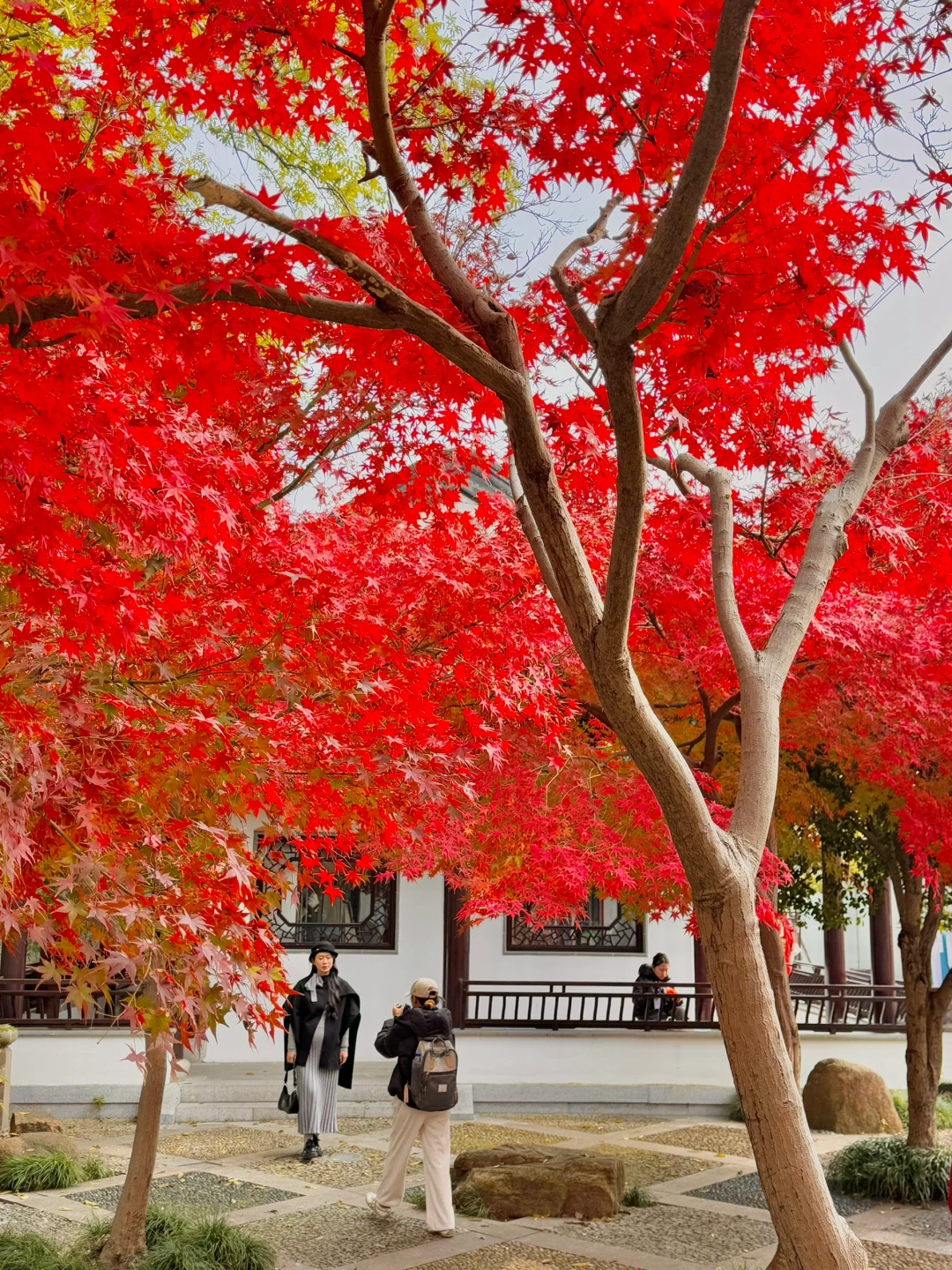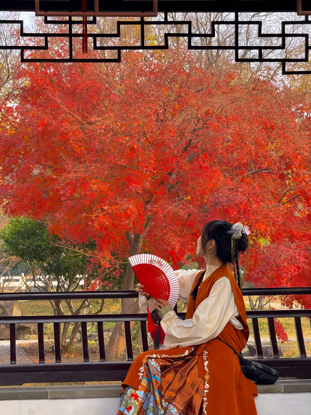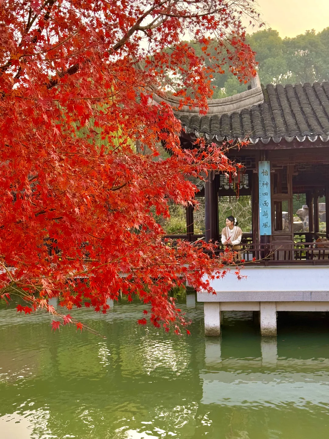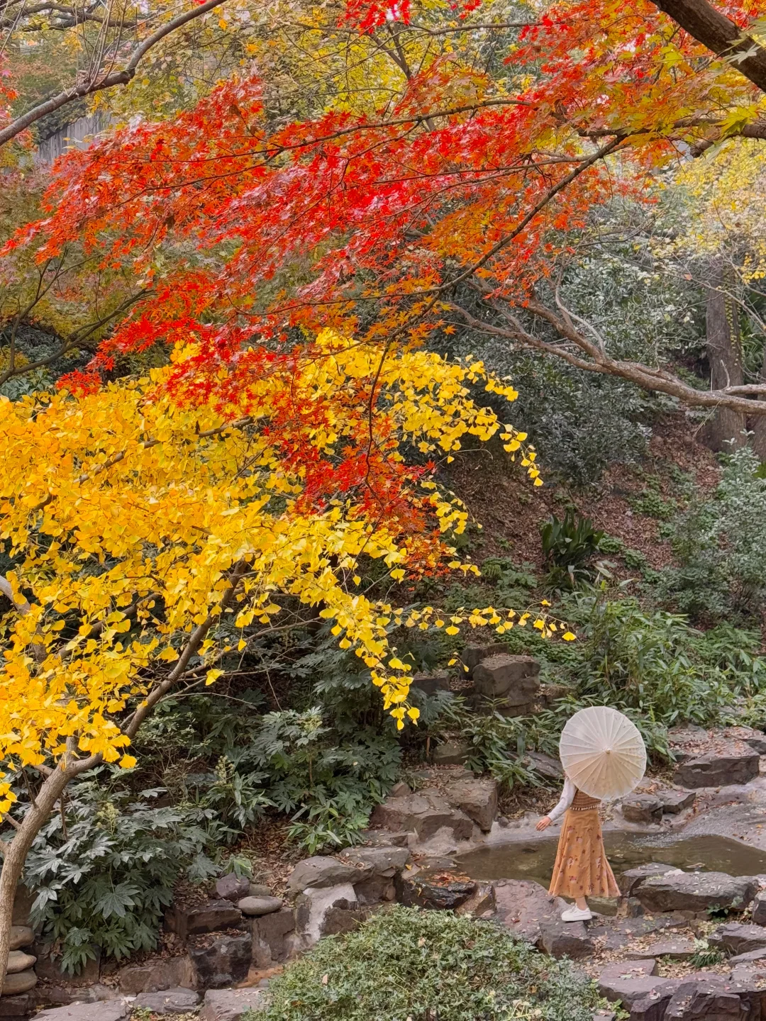 🔸榭园:池边的枫树在阳光照射下闪闪发光,除了站在树下出片,还可以利用长廊做框景,也很好看~