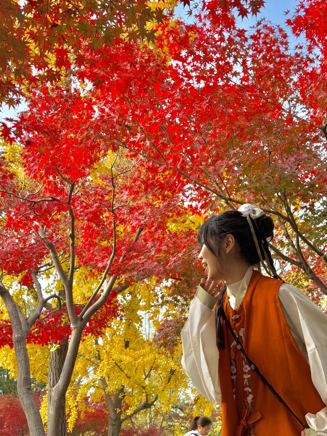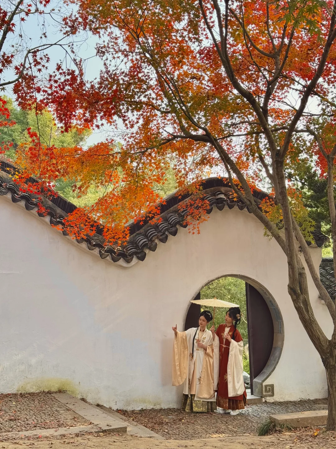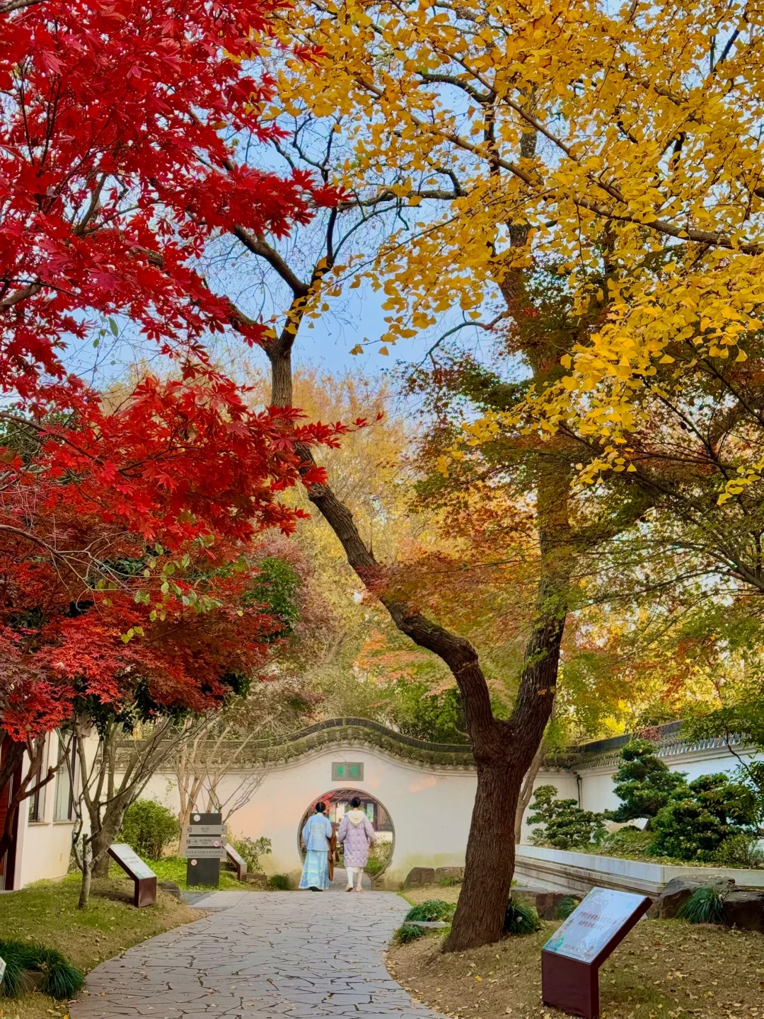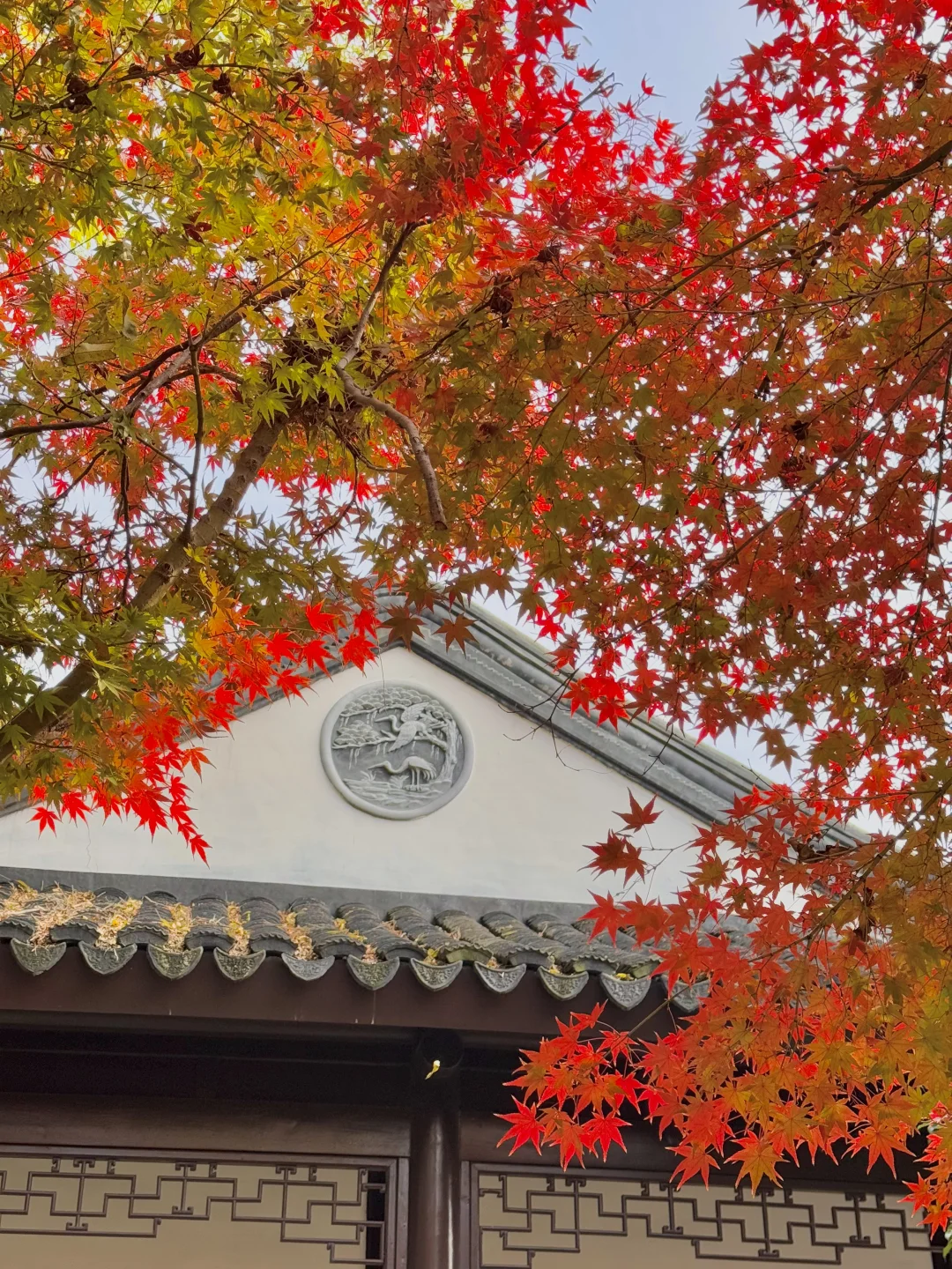 🔸榭园:池边的枫树在阳光照射下闪闪发光,除了站在树下出片,还可以利用长廊做框景,也很好看~