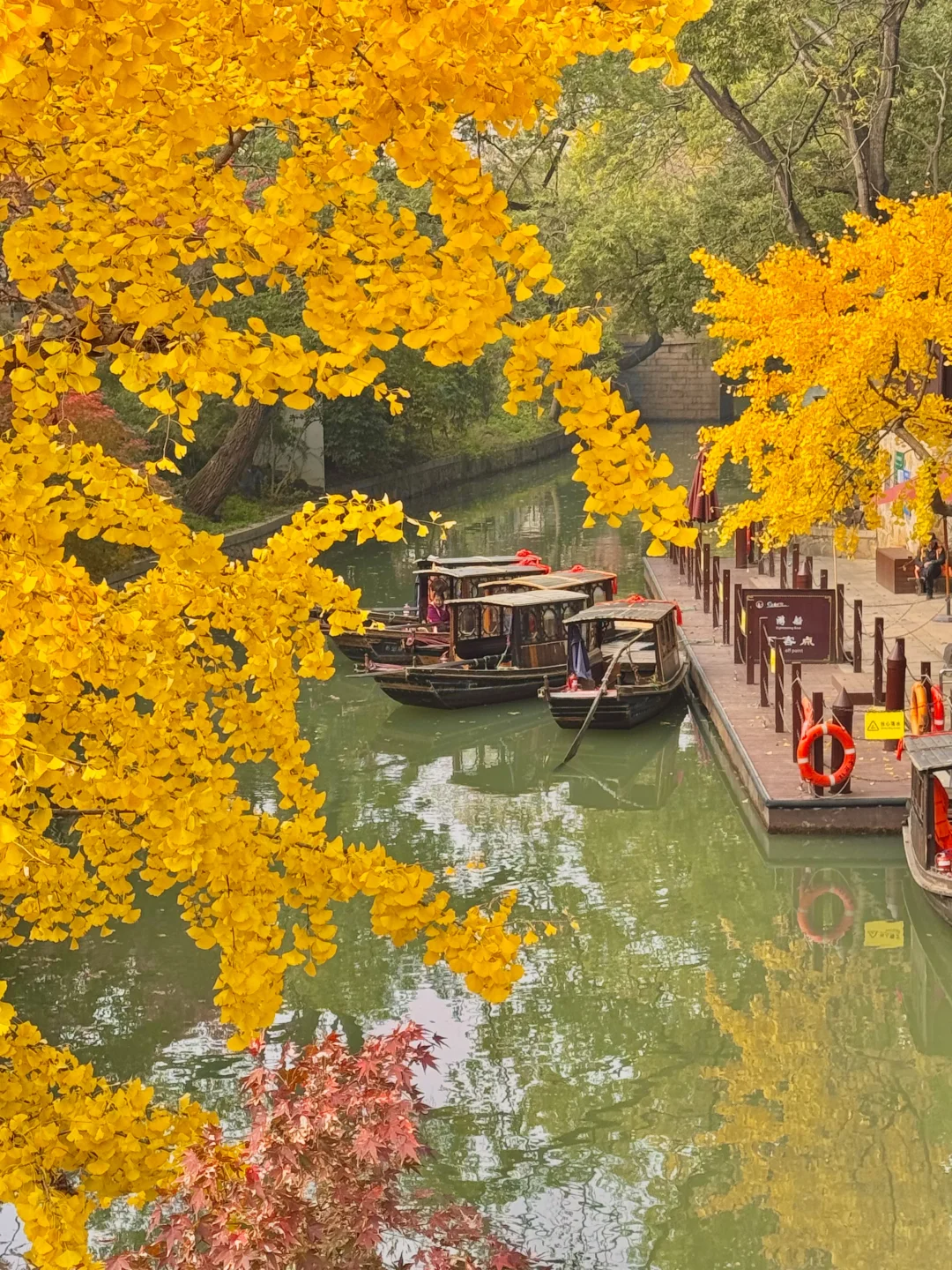 🔸海涌桥:桥前面有一大片正在变色的枫叶,红绿交杂很好看,一旁的金色银杏相互撞色很奇妙~在桥上拍银杏叶包裹摇橹船的画面也很美